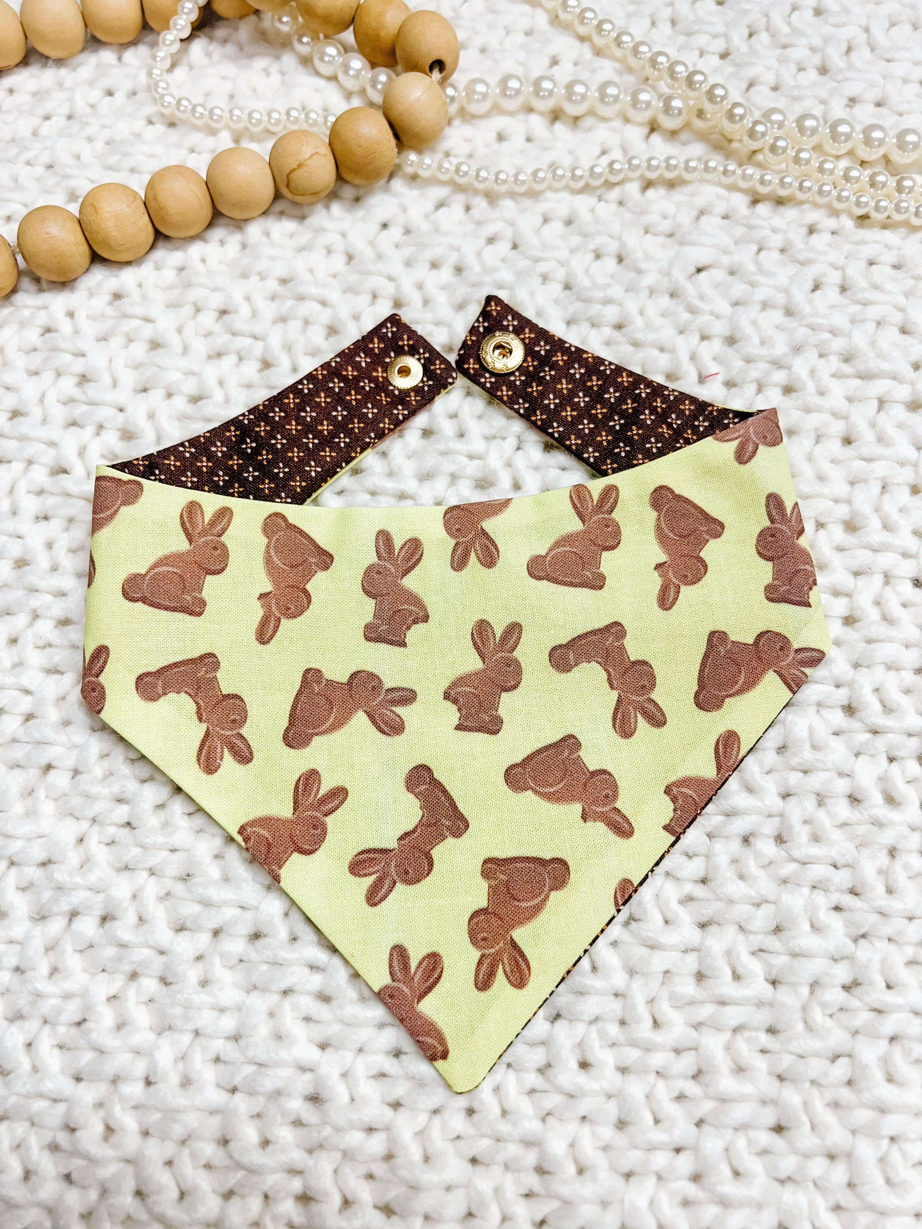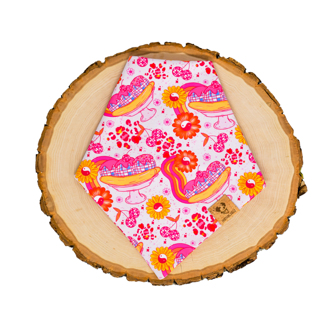 - Handcrafted in California - Material: Poly Woven with a soft, smooth, and buttery feel. Poly woven is less prone to wrinkles and dries quicker than cotton. Classic Tie On Style - Our classic bandanas are triangle shaped and easily adjustable. - Roll down the bandana to adjust the height so that it is the perfect fit for your pet. - Preferred by pet owners with pets that are still growing and need a more adjustable fit. - Each bandana comes with a cork "Everything Doggo" label Fit and Sizing (Classic Tie On) XX-Small: Up to 8 Inches X-Small: Up to 11 Inches Small: Up to 13 Inches Medium: Up to 15 Inches Large: Up to 17 Inches X-Large: Up to 20 Inches