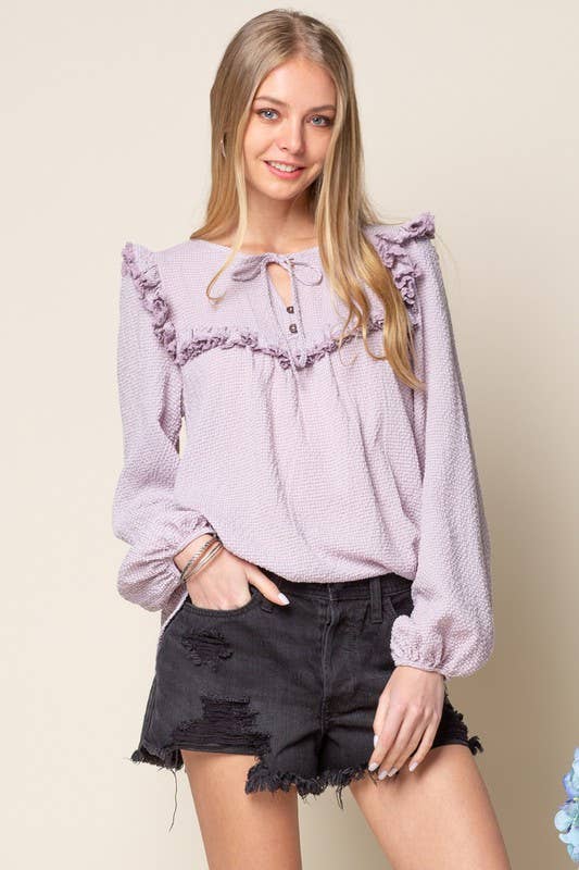 Round Neck Ruffled Yoke Puff Long Sleeve Plaid Blouse W/ Button Closure at Back Neck 100%POLY TOTAL LENGTH 25"| BUST 20"| SLEEVE LENGTH 26"| SHOULDER 13" MODEL IS 5'7 1/2"| BUST 33"| WAIST 24"| HIPS 34"| WEARING SIZE SMALL