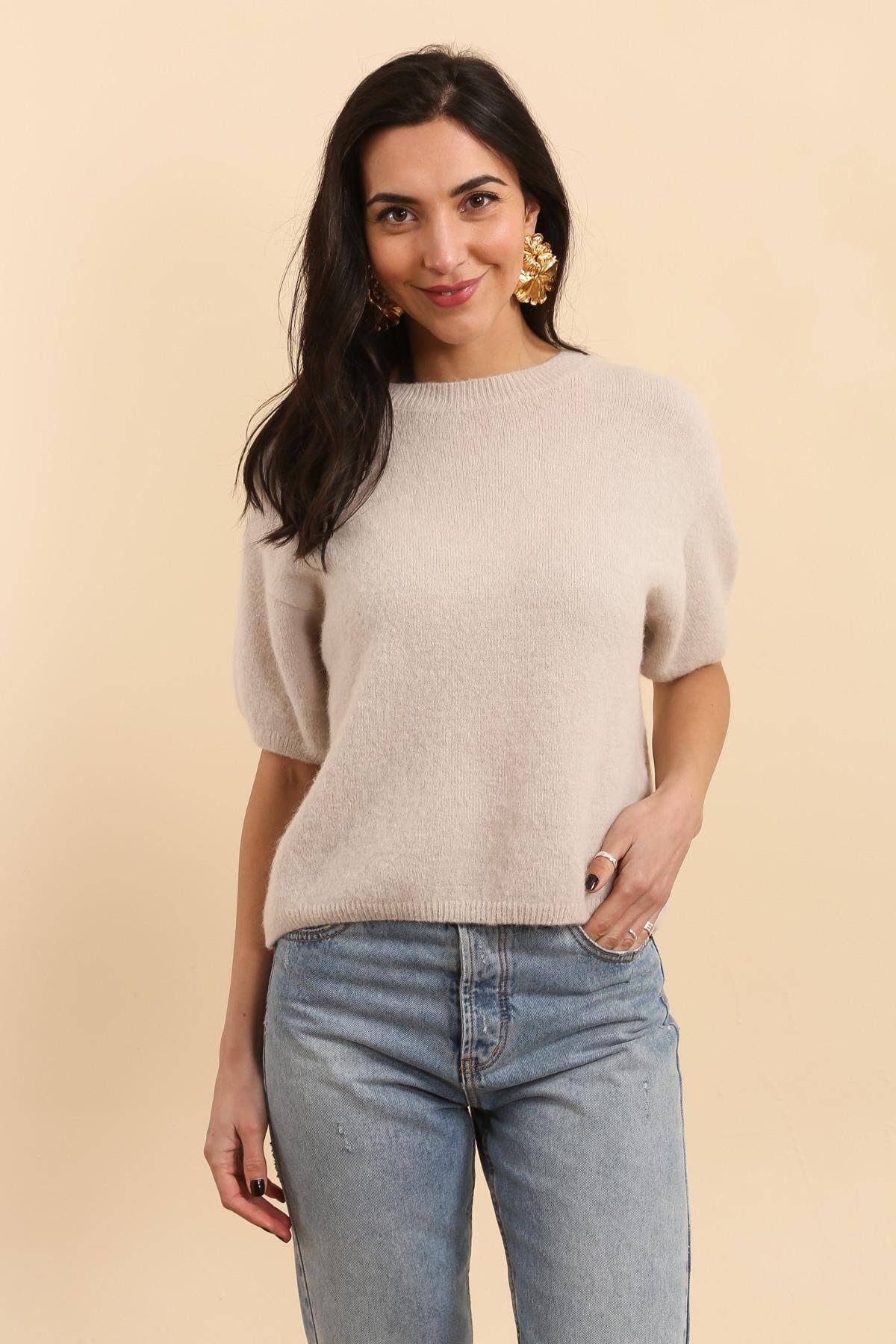SUPER FINE ALPACA SHORT BUTTON CREW NECK CARDIGAN 31% POLYAMIDE 30% SUPERFINE ALPACA 28% ACRYLIC 10% WOOL 1% ELASTANE ONE SIZE (36-42) THE MANNEQUIN MEASURES 1.71m PRODUCT MADE IN ITALY REF AL11018