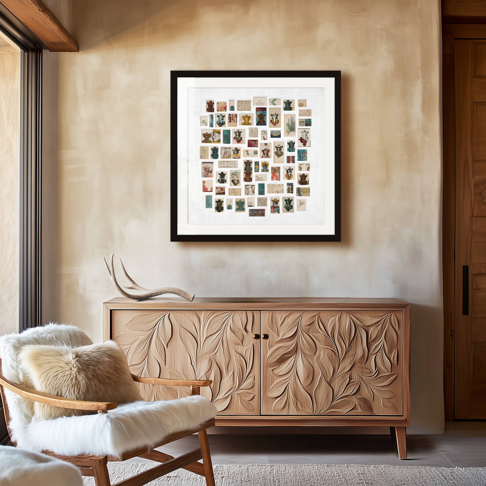 Limited edition giclée print by Denver artist Dolan Geiman. Each print is a detailed reproduction of an original Geiman paper collage printed on matte art paper, signed and numbered. Each original paper collage was constructed from reclaimed, upcycled materials. *Sizes: 24 x 36 || 30 x 42 *Packaging: medium and large unframed prints ship rolled inside their own individual kraft tube with end-cap labeled (see photos) *Hangers: search product Print Hanger | Magnetic | Walnut for walnut hanger product details. *Shipping: Unframed prints ship in 1-3 days. Hummingbird Southwestern home decor wall art. Desert art. Western art. Large wall art.