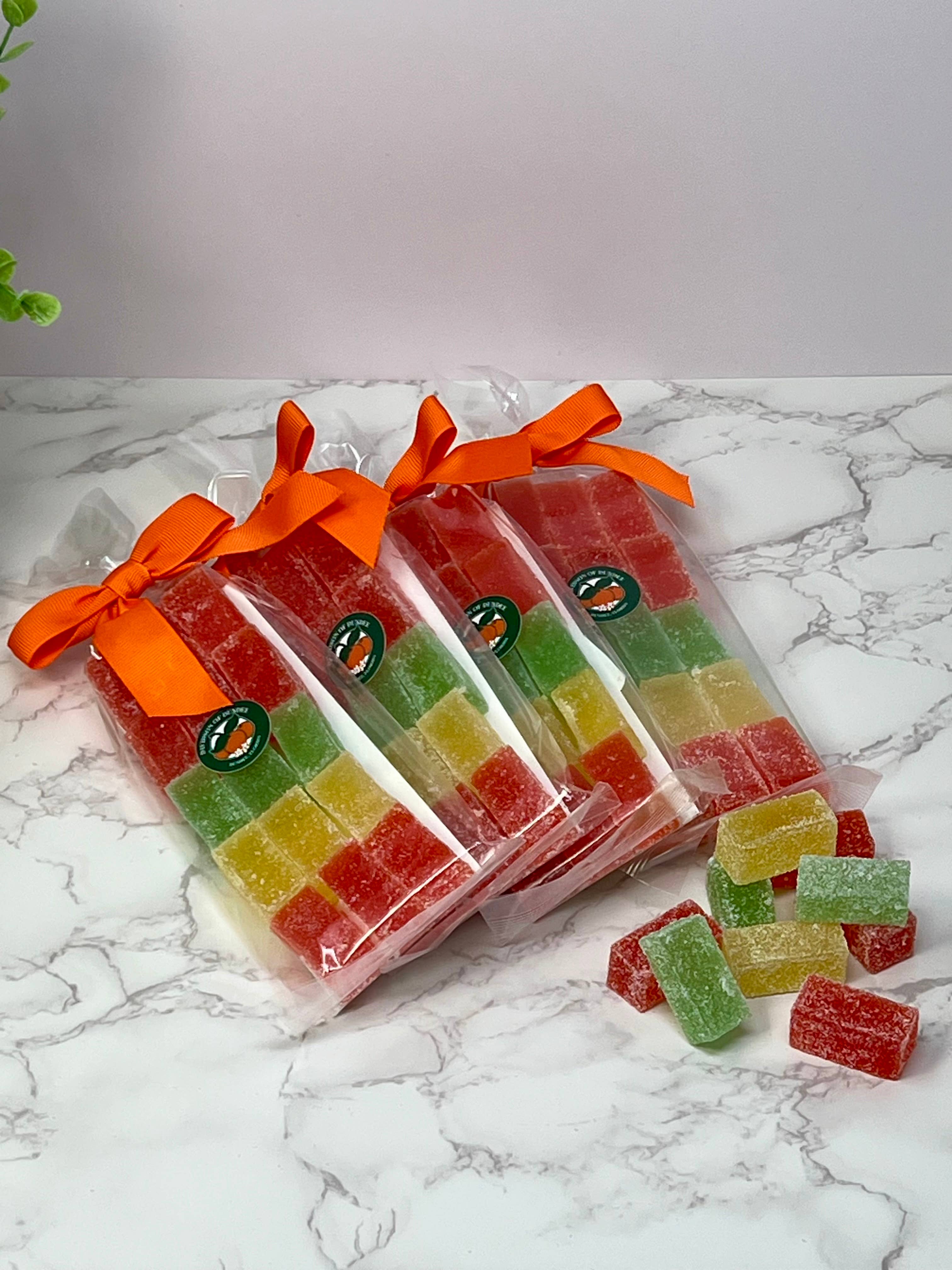 These candies are the five-ingredient wonders that made us famous. Made simply with fruit, cane sugar, fruit pectin, tartaric acid (from grapes) and a shot of plain old fashioned corn syrup, each deceptively simple batch actually takes weeks from start to finish due to our secret reduction process which intensifies the flavor and firms the texture. Our beautiful handpacked combination box features pure Cranberry, Marion Blackberry, Red Raspberry, Key Lime, Ruby Red Grapefruit and Orange pates de fruits. A perennial customer favorite. Our fruit jelly candies contain: No gluten. No artificial colors, flavorings or preservatives. No high fructose corn syrup. Only pure cane sugar.