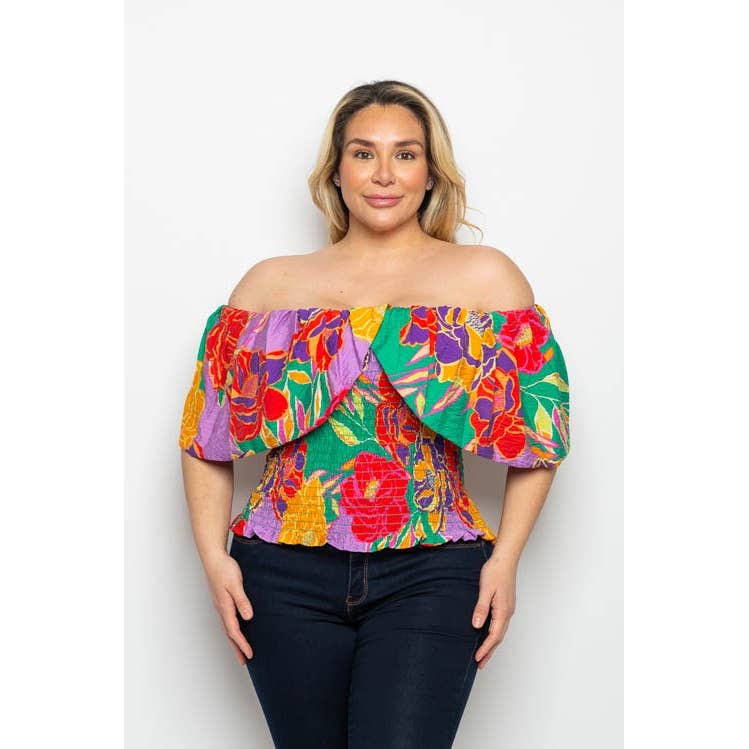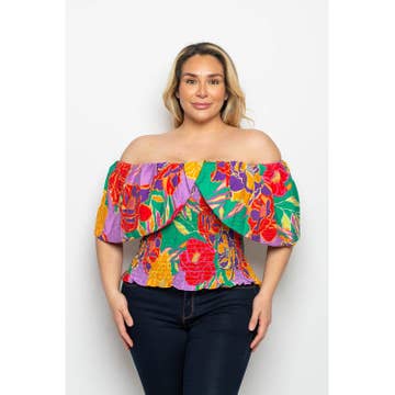 Off shoulder ruffle Mexican top made of stretch fabric by Paulina Sizes Available US sizes S/M L/XL 1X/2X Product Details: - Contemporary fit - Elastic Off shoulder or boat neck. - Stays in place when arms are raised - Made of soft double sueded faux fabric - Machine wash with like colors - Dry in low heat. Measurements: S/M (Fits like Size M) Chest: 33" Waist: 30" Hips: 37" Length: 25" Neck opening: 38" L/XL (Fits like Size L) Chest: 35" Waist: 32" Hips: 40" Length: 26" Neck opening: 39.5" 1X/2X (Fits like Size 1X) Chest: 38" Waist: 35" Hips: 42" Length: 27" Neck opening: 41"