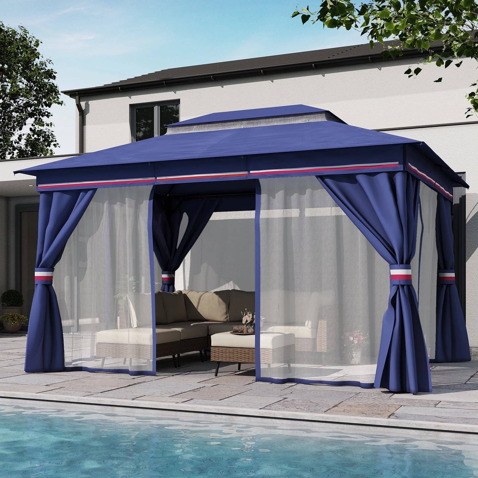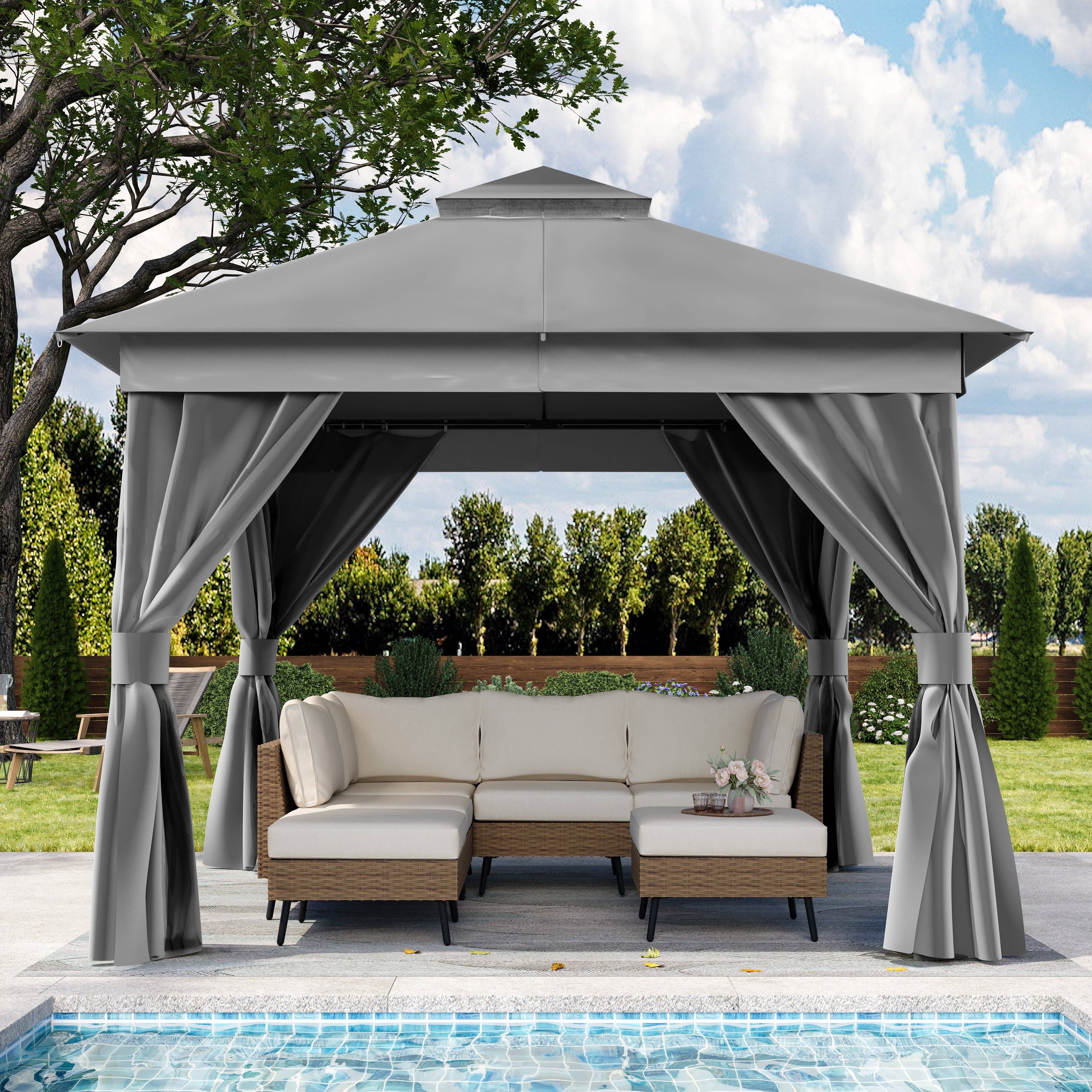 Stylish Double Roof Gazebo with Mosquito Netting Enhance your outdoor experience with the LAUSAINT HOME 10'x10' Patio Gazebo, designed to provide a perfect blend of style and functionality. This robust gazebo is meticulously constructed to offer durability and comfort, making it an excellent choice for any outdoor setting. Key Features: * Heavy-Duty Construction: Built with a galvanized iron frame that withstands winds up to level 7, ensuring long-lasting stability. * Strong Roof Support: Roof frame supports up to 250 lbs, perfect for adding decorative elements or light fixtures. * Sun Protection: Fade-resistant and UV-resistant fabric with UPF 50+ safeguards against harmful sun rays.