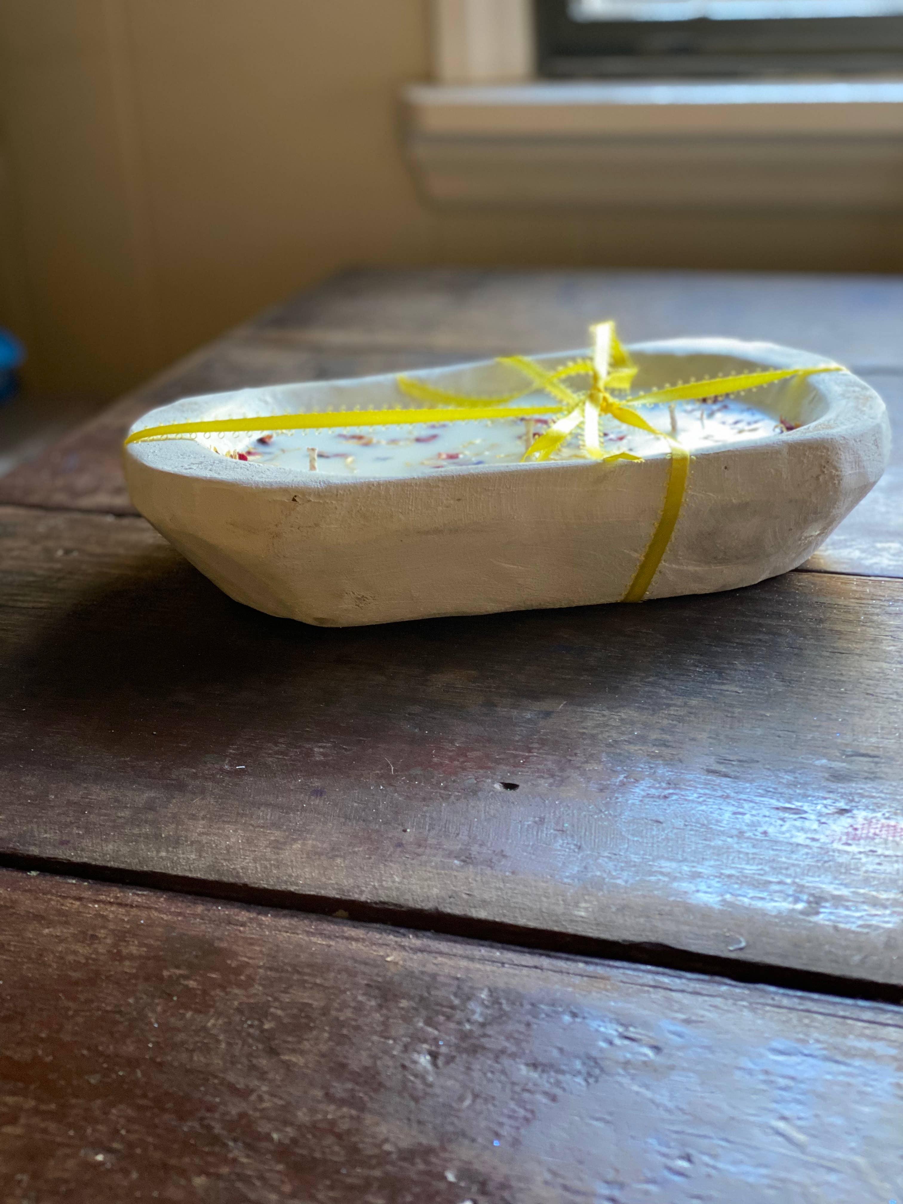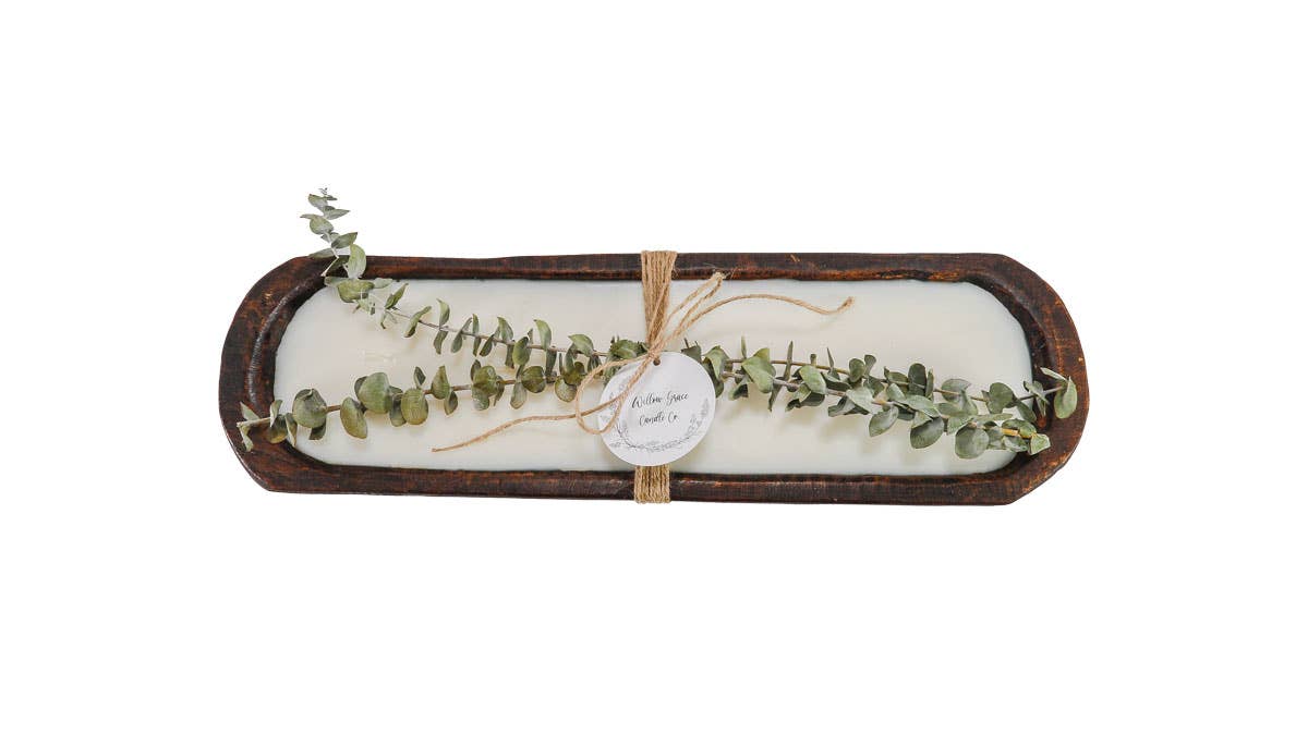 These lovely dough bowl candles are the perfect addition to any home. The bowl itself measures 9-10" 5-6" by 1.5" and encompasses 16 ounces of coconut-soy wax, phthalate free fragrance oils, and three eco wicks for ultimate clean burning. When they are done burning, use as a great accent piece or catchall or purchase a refill kit in a new great scent.