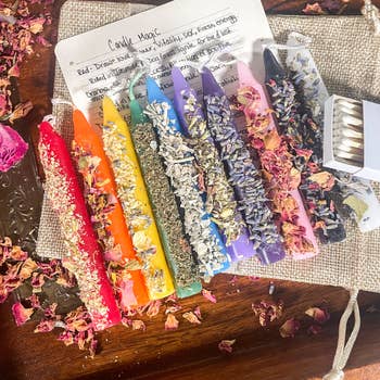 Self love is sued for confidence and happiness. *Each pack comes with 2 candles. Each are dressed with herbs and oils. * Each pack will come with an instruction card on how to use your ritual candle. *The candles themselves are not scented, but they have a slightly scent from the herbs. *Warning stickers are on the back of each pack. Candle Height: 5 inches Candle Width: 1/2 inch All of our ritual candles are made at our warehouse here in Nashville.