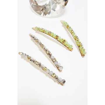 Expertly crafted with high quality gemstones, this 3-pack snap hair clip set adds a touch of elegance to any hairstyle. Each clip features a cluster of gemstones in unique designs, perfect for any occasion. Stay stylish and secure with these beautiful yet functional hair clips. HEIGHT: 0.85" WIDTH: 2.8"