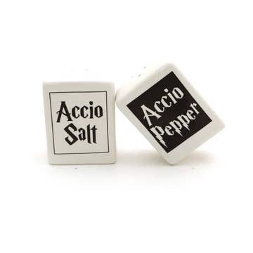 Accio Salt and Pepper shakers- great gift for a wizard loving cook or foodie- even if they are a muggle! Makes every meal magical! Listing is for shaker set only- books and wand are not included and are photo props only. Handmade in my New Jersey studio from cast stoneware these measure 2.5 inches high x 1 x 2 (rectangular in shape). Glazed a glossy, lead free white, kiln fired to over 1900 degrees. Ships with a removable silicon stopper.