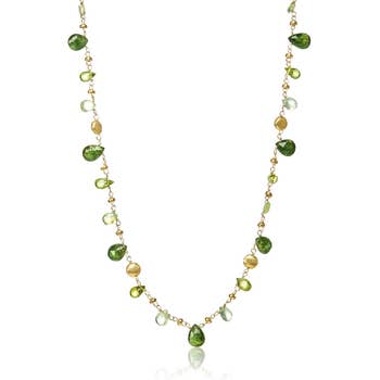 Cultured pearls, peridot, chalcedony, glass beads, stainless steel