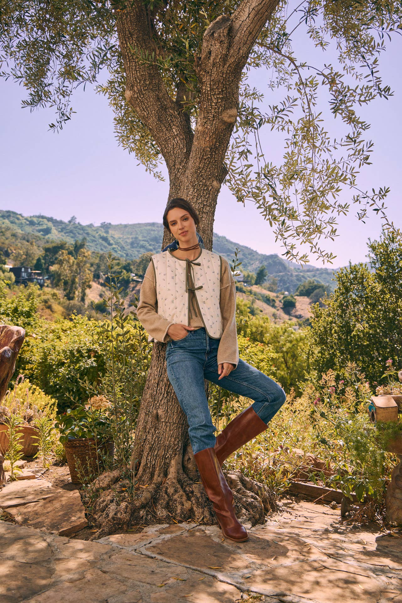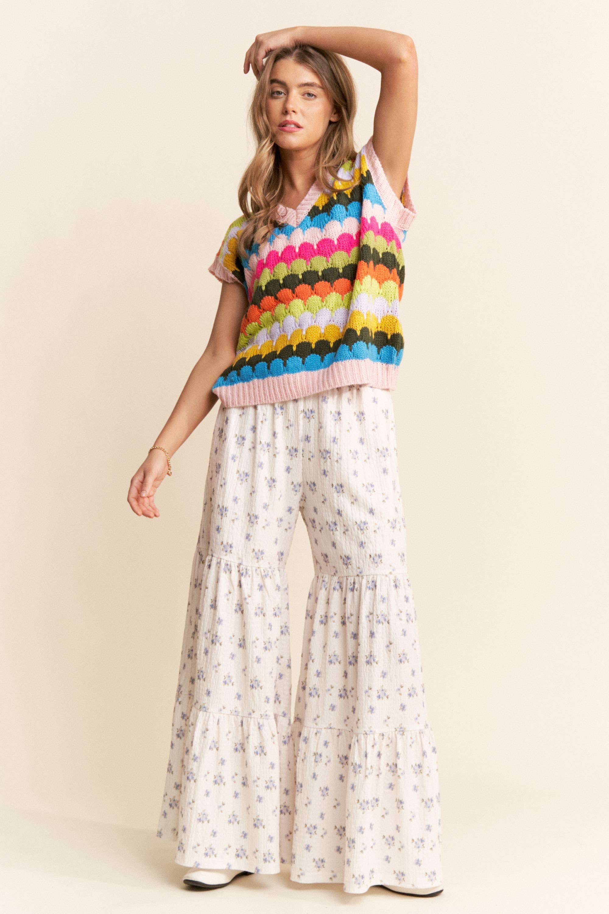 * Style No.: E2137SW Featured in our FW25 lookbook, this is the kind of knit that tells a story. Crafted from a recycled polyester and wool blend, this poncho-style sweater vest brings warmth, movement, and an effortless sense of charm. It features a soft V-neckline, subtle stripe contrast, and playful tassels at the sides—adding texture and flow to your look. Wear it layered over a romantic button-down for an autumnal take on light layering, or pair with a plaid shirt for a nod to the western trend. Toss on a denim jacket for a cool-weather look that feels both nostalgic and new. It’s eco-conscious, cozy, and endlessly versatile—the kind of knit that brings springlight into fall. Features - V-neckline - Sweater poncho / sweater vest - Thin stripe contrast detail - Side tassels with tie Size + Fit Model is 5'9.5" and wearing a size Small. Please refer to our size chart. Contents: - 45% RECYCLED POLYESTER 45% ACRYLIC 7% WOOL 3% SPANDEX