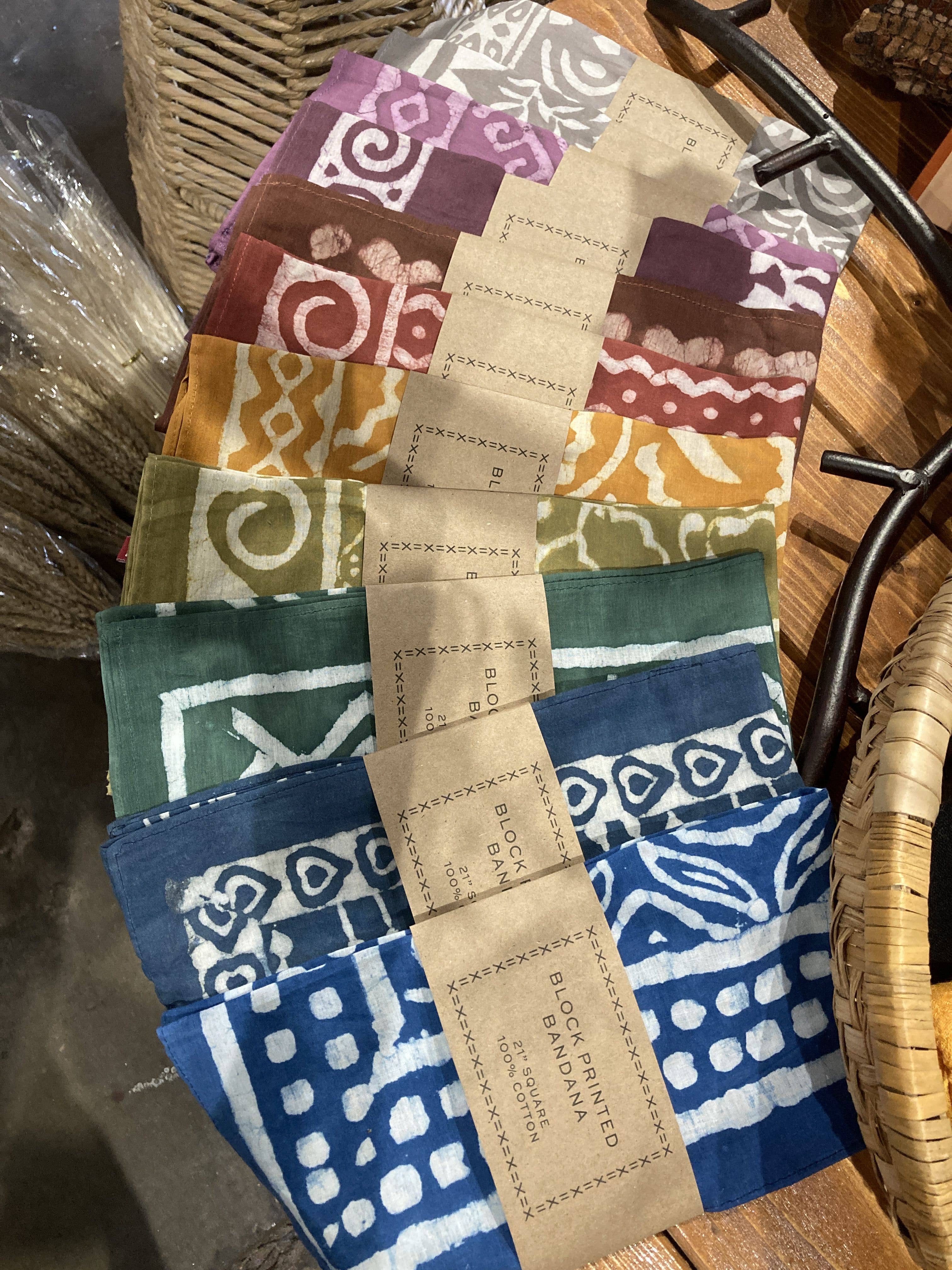 Lightweight and ultra-soft cotton, our bandanas feature the traditional art of hand block printing using eco-friendly pigments and dyes. Size 21" x 21" and material is 100% cotton.