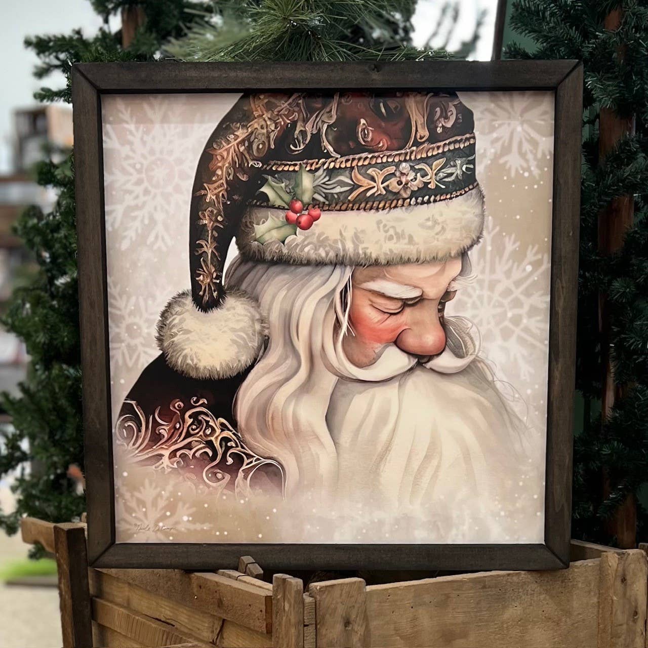 This picture is called "Santas Cardinal". The print unframed measures 12x16 inches. The frame will add about one more inch per side. In this heartwarming winter scene, Santa Claus stands outside, dressed in his iconic red suit, complete with white fur trim. His warm, joyful smile adds a sense of cheer to the chilly atmosphere. In one hand, Santa gently holds a vibrant red cardinal, as if he’s trying to place the bird on the branches of a beautifully decorated gold Christmas tree beside him. The tree sparkles with gold ornaments, shimmering lights, and delicate decorations, creating a magical holiday atmosphere. The cardinal, with its bright red feathers, stands out beautifully against the backdrop of the winter landscape and the golden tree, adding a touch of nature’s beauty to the holiday magic. This picture captures the spirit of Christmas, with Santa's kindness and the serene beauty of the season. Choose your lath frame color to customize your product.
