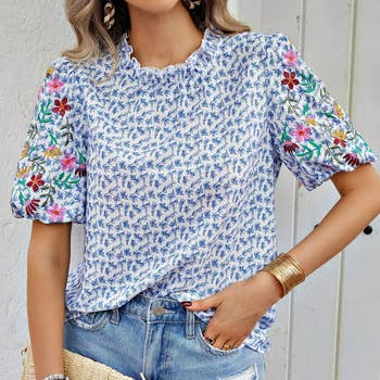 【Stylish Puff Sleeves】 Features elegant puff sleeves with slight gathers for a voluminous silhouette and romantic flair. 【Beautiful Floral Embroidery】 Bold, vibrant embroidery decorates the sleeves with botanical patterns, perfect for spring and summer aesthetics. 【Comfortable Textured Fabric】 Made of breathable, soft polyester fabric with a textured finish that adds dimension and interest. 【Versatile Everyday Top】 The relaxed fit and round neckline make it easy to pair with jeans, skirts, or shorts for casual-chic looks. 【Effortless Feminine Style】 Ideal for brunch dates, weekend getaways, or vacation wardrobes—adds a pop of color and artisanal touch to any outfit. Brand labels are not included by default. If needed, please add them via this link ($0.50/pc): https://www.faire.com/product/p_mbyt838sy8
