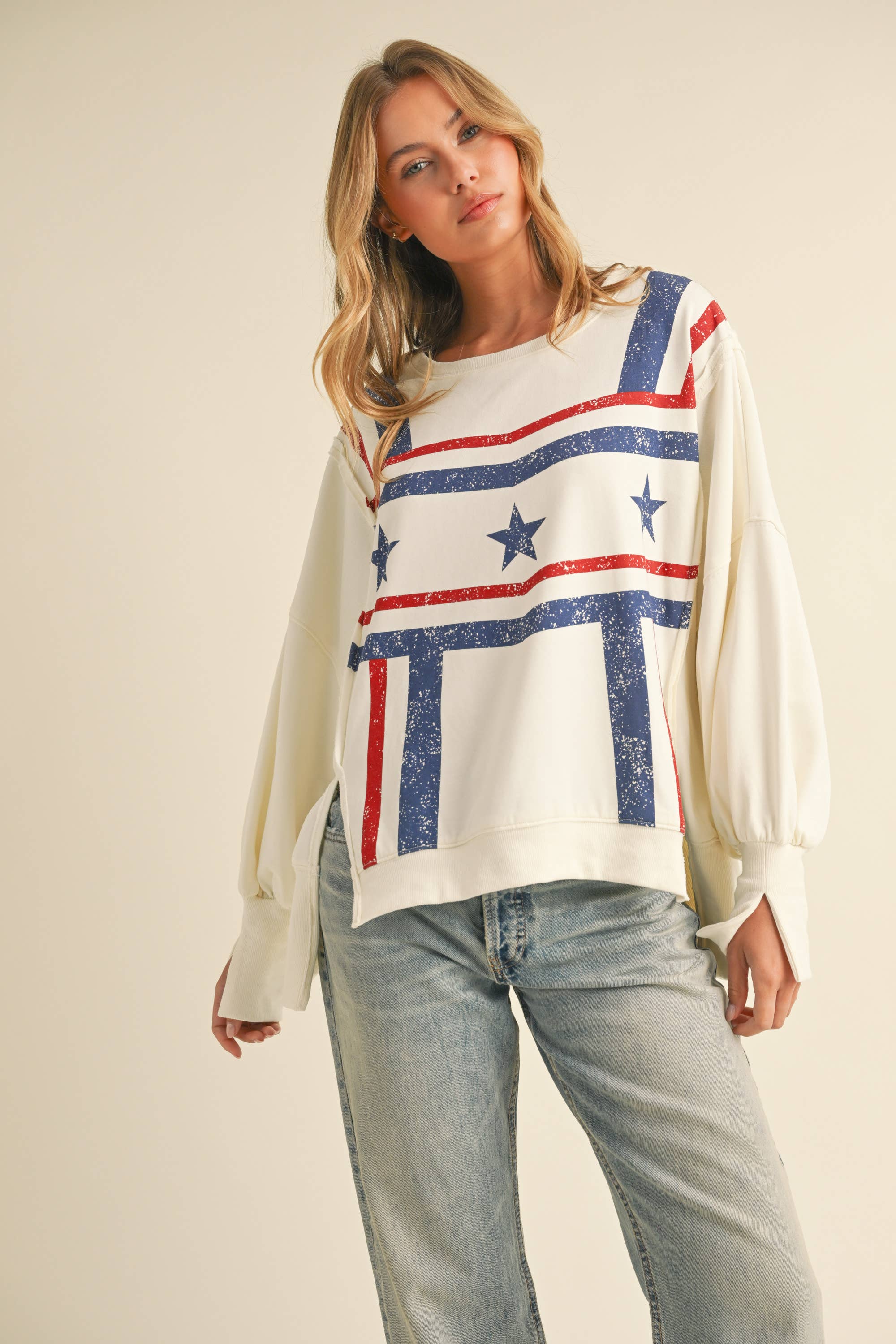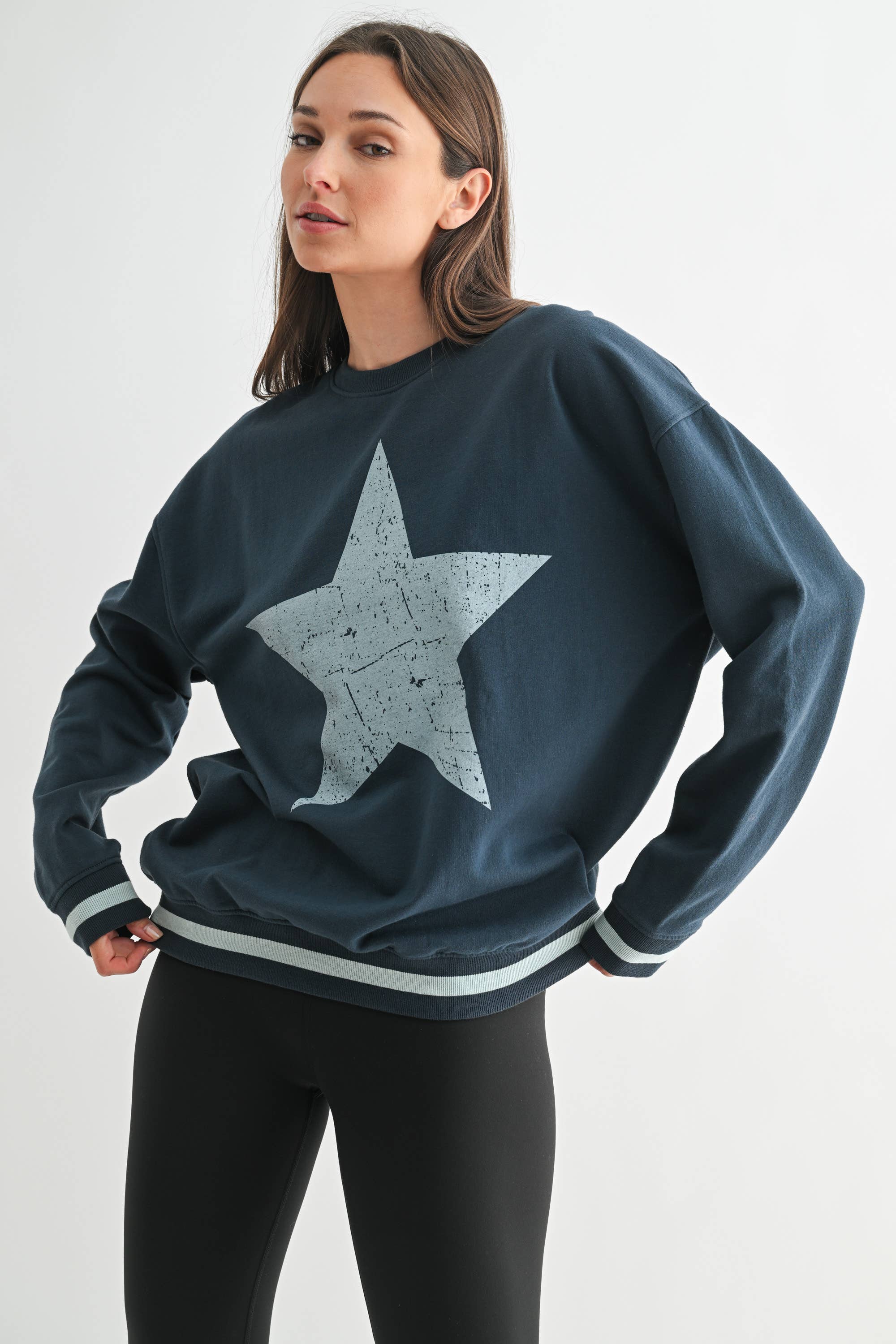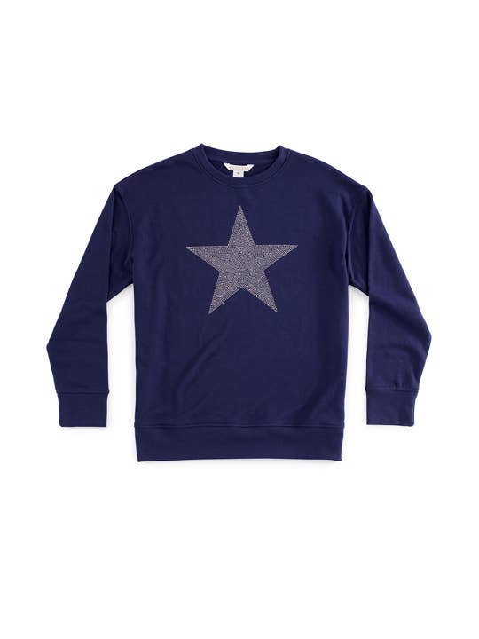 A cult favorite with a glam twist. Our bestselling style features a buttery soft to the touch thanks to the burnout wash treatment that also adds an edgy take on this classic silhouette. Pairs perfectly with 451 Campus Sweatpants. Features: - silver rhinestone stars on sleeves - rib at neckline, cuffs, and hem - dropped shoulders - relaxed bottom hemline Fit: Oversized, unisex 60% cotton, 40% polyester. Burnout Fleece. 270 GSM