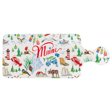 A lightweight wooden serving tray made from FSC-certified birch wood veneer. The tray measures 11"x5". The tray has been tested to comply with CA Prop 65, FDA 21 CFR 177.1460, and EU 10/2011 Food Contact Material. It ships from New Hampshire and is made in Finland, and shipping is free for orders $500+. The lead time is about three weeks. The featured artwork is created by Kate Nelligan. She is best known for her colorful graphic designs originating from cut paper collages and block prints. Her coastal designs and patterns are reminiscent of summers in her favorite place, her hometown of Kennebunkport, Maine. For many years, she worked as a product designer developing collections for the gift and home décor markets until launching her own design collection, all with a coastal flair. The item is protected by a thin matte melamine layer, and it is not recommended to be washed in the dishwasher as colors may fade.