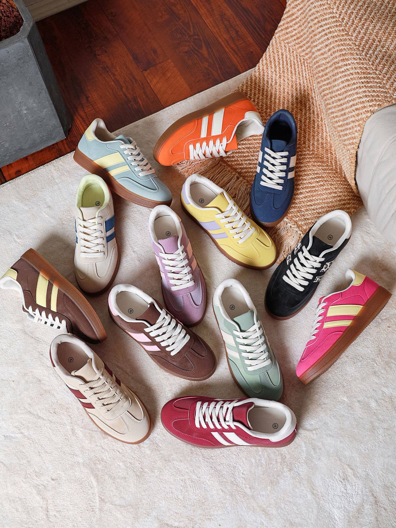 WOMEN'S GUM SOLE SNEAKERS. • Colour: BLACK, BEIGE, RED, GREEN, LEOPARD, KHAKI, BLUE, PURPLE, BROWN • Heel Height: Approx 1.5 inches • Packaging: Box • Fastening: Slip On • Upper Material: Synthetic • Lining Material: Synthetic • Sole: Rubber • Range: SS2025