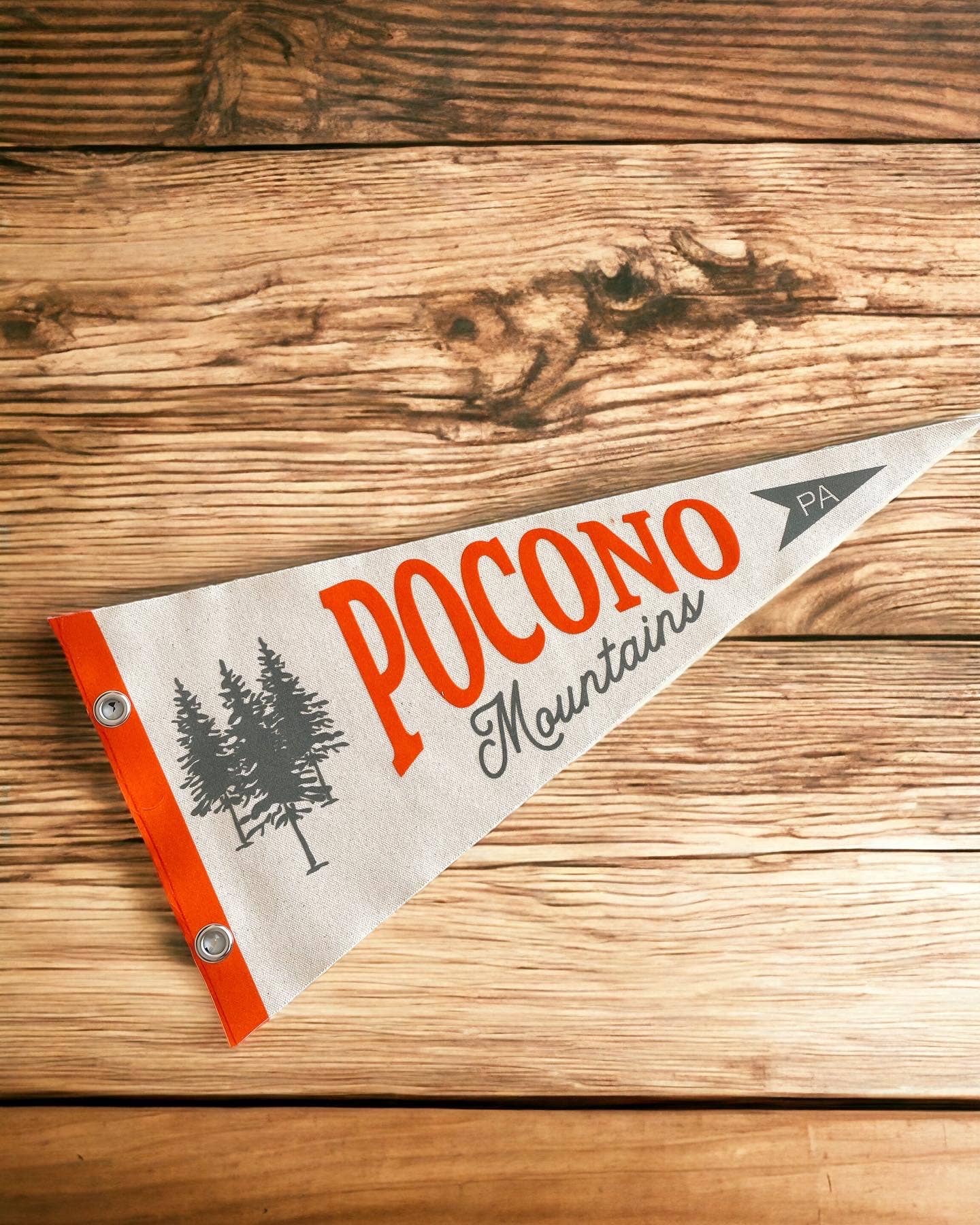 Canvas pennant Available in sizes 12x24, 9x18, 9x27. Quality pennant decorated with a raised flock material to give it a vintage look. Edge strip has grommets for hanging. The pennant will add fun to any space. Pennant is natural color and made of duck canvas. Design is red and olive