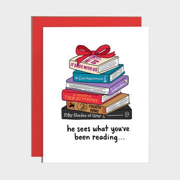 Key Details: - A2-Sized Card (4.25 in. x 5.5 in.) - Packaged in a clear bag with a matching envelope - Printed on high-quality paper - Blank Inside - Occasion / Themes: Bookish, Romance Books, Spicy Books, Christmas, Holiday This card is for the spicy romance reader who knows that Santa sees everything, including their stash of steamy novels. Make them laugh with our A2-sized (4.25 in. x 5.5 in.) ‘Santa Saw What You Were Reading’ cheeky holiday greeting card. It’s blank inside for your own heartfelt message.