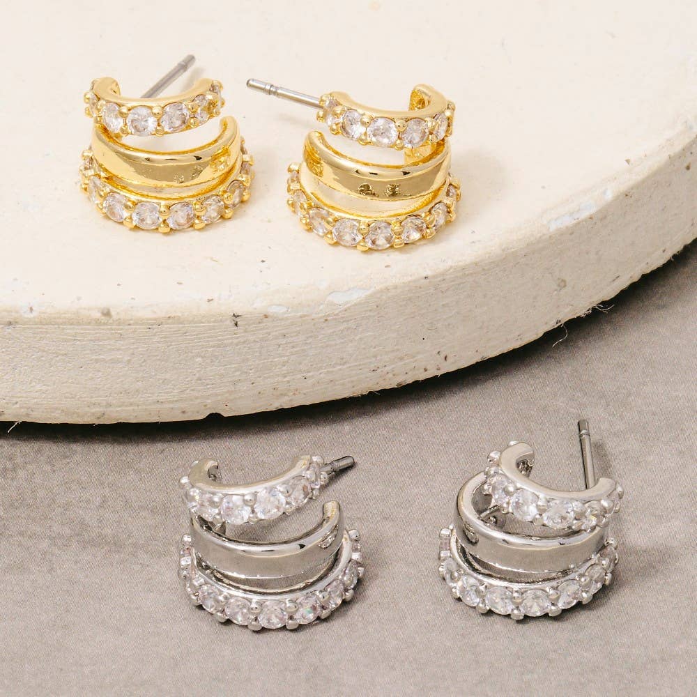 Baguette Stone Double Hoop Huggie Trio Earrings. Featuring a stylish double hoop design accented with dazzling baguette stones, these earrings offer a perfect blend of sophistication. Product Details: Length: .35" - .5" Width: .35" - .5" earring back: Post metal finish: Gold Plating product: Lead & Nickel Compliant anti-tarnish: Double E-coating The titanium posts ensure durability and hypoallergenic wear, making them suitable for sensitive ears. Hypoallergenic post Surgical steel post Lightweight post Durable post Geometric Hoops | Simple Gold Hoop Earrings | Simple Lightweight Earrings | Minimalist Earrings | Bubble Earrings | Puffy Earrings | U shape earrings | Square Earrings |Hoop Earrings | Huggie Earrings |