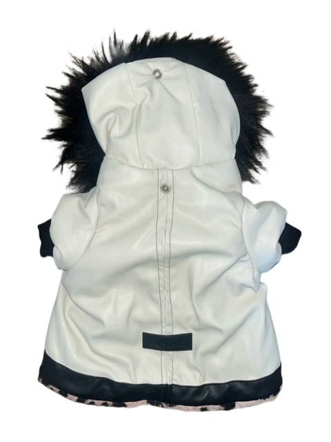 Raglan shirt hoody with pocket on back Grafitti print with fur trimming on hoody Breathable comfy techno fleece fabric Made In Italy Keyhole in back neck to pull leash through Made in NYC