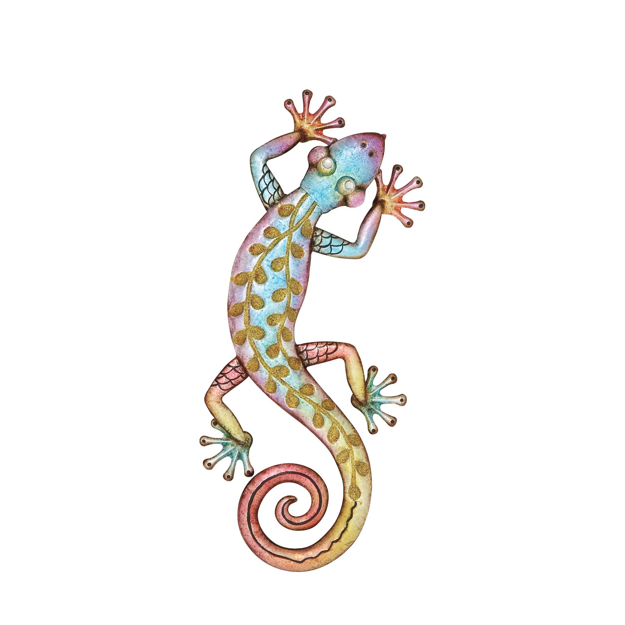 A-55104: MULTI COLORED METAL LIZARD INDOOR OUTDOOR HOME WALL DECOR WITH DIAMOND AND SWIRL DETAILS, 30" X 14" X 2". Create a balanced space in the most creative way with this expertly crafted wall decor for captivating focal point. Showcase your personality and turn your walls into an art gallery with this captivating wall decor. This lizard wall sculpture can breathe life into your outdoor garden or indoor living area by adding textural dimensions to your wall space. This item ships in 1 carton. Can be hung vertically using the keyholes; nails and screws not included. A great versatile decor for indoor or outdoor display but are not rust or weather resistant. This item ships fully assembled in one piece. This is a single multi colored wall sculptures. Eclectic style.