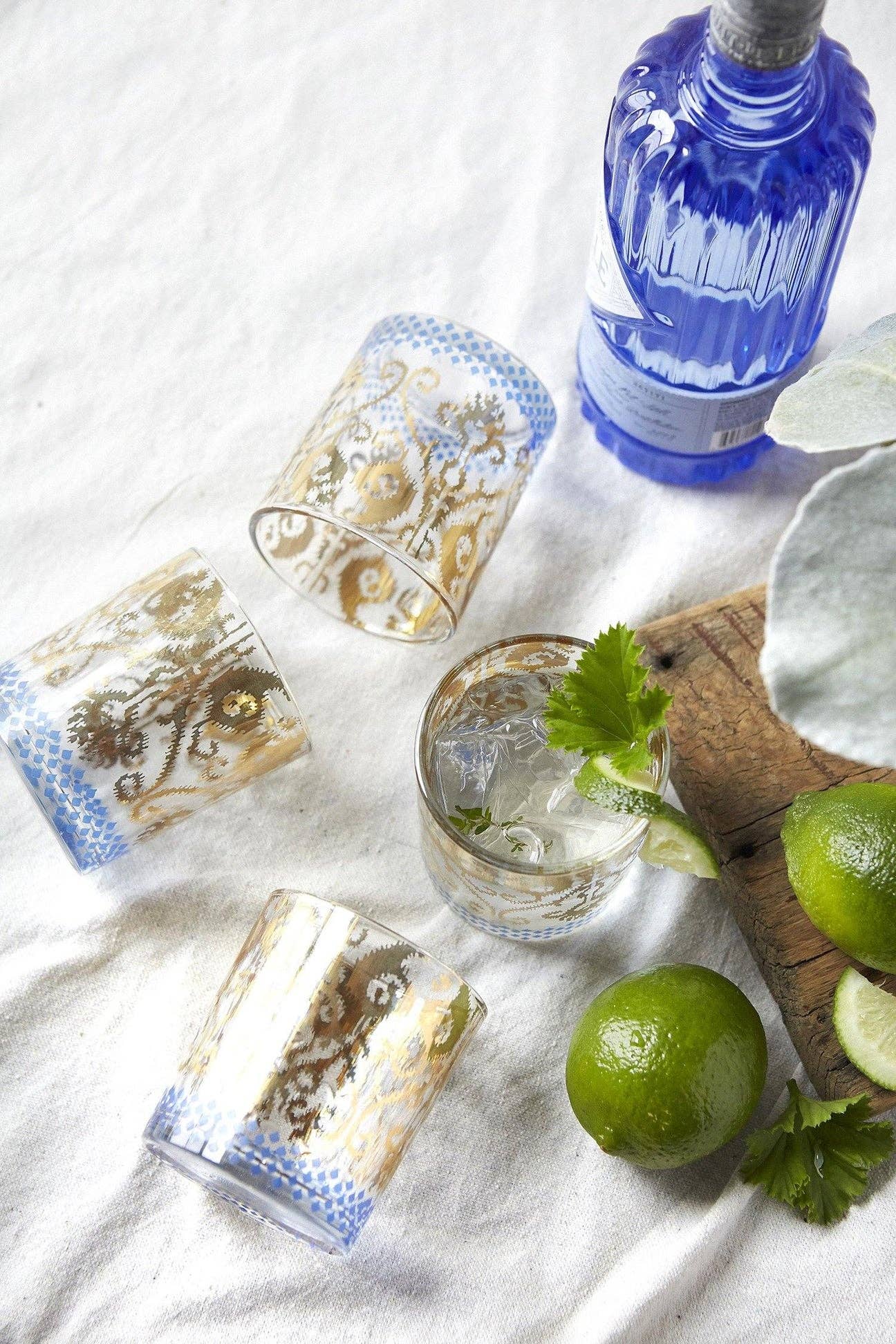 A brilliant set of white cocktail glasses.. an elegant layer to your stylish entertaining. Cheers!! Our Patina Vie cocktail glasses are a fashionable accessory for the most seasoned entertainer. Sip... toast.... sip some more. 18K gold will add that kicky shimmer you've been yearning for. (We're obsessed).. Sold as a S/4 Measurement: 12 oz. 3" Diameter x 3.5"H Import