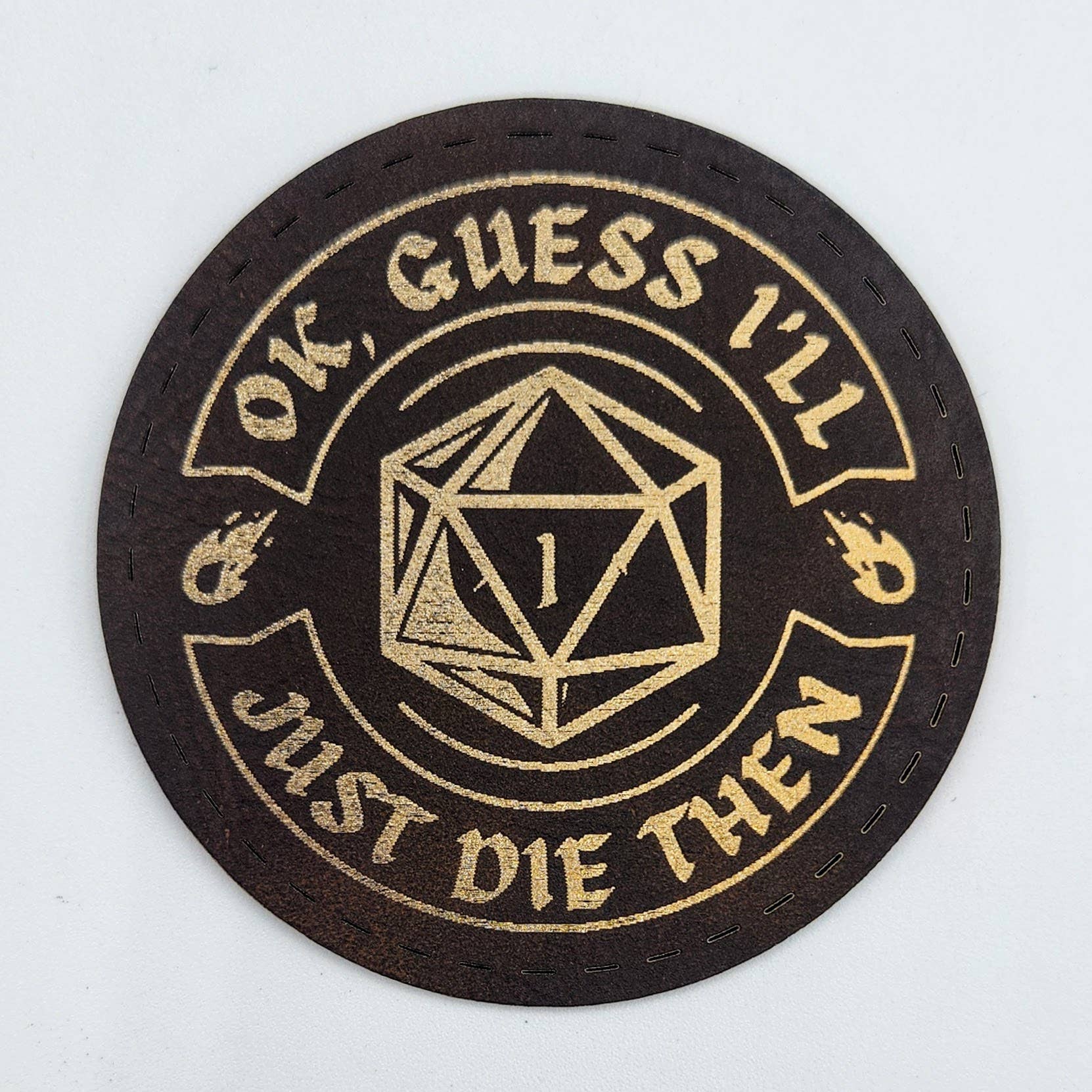 2.8" Circle - Original design laser etched on faux leather with heat activated adhesive backing. D&D Inspired, RPG Game D20. Packaging not included. -Attaching With a heat press - 300 degrees for 15 seconds from the front of the patch. -Attaching With a household iron - 300 degrees (wool setting) for 15 seconds from the back side of the fabric. Recommend spot cleaning with a damp cloth.