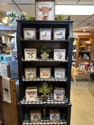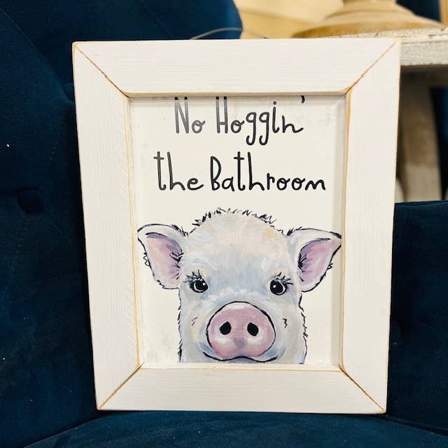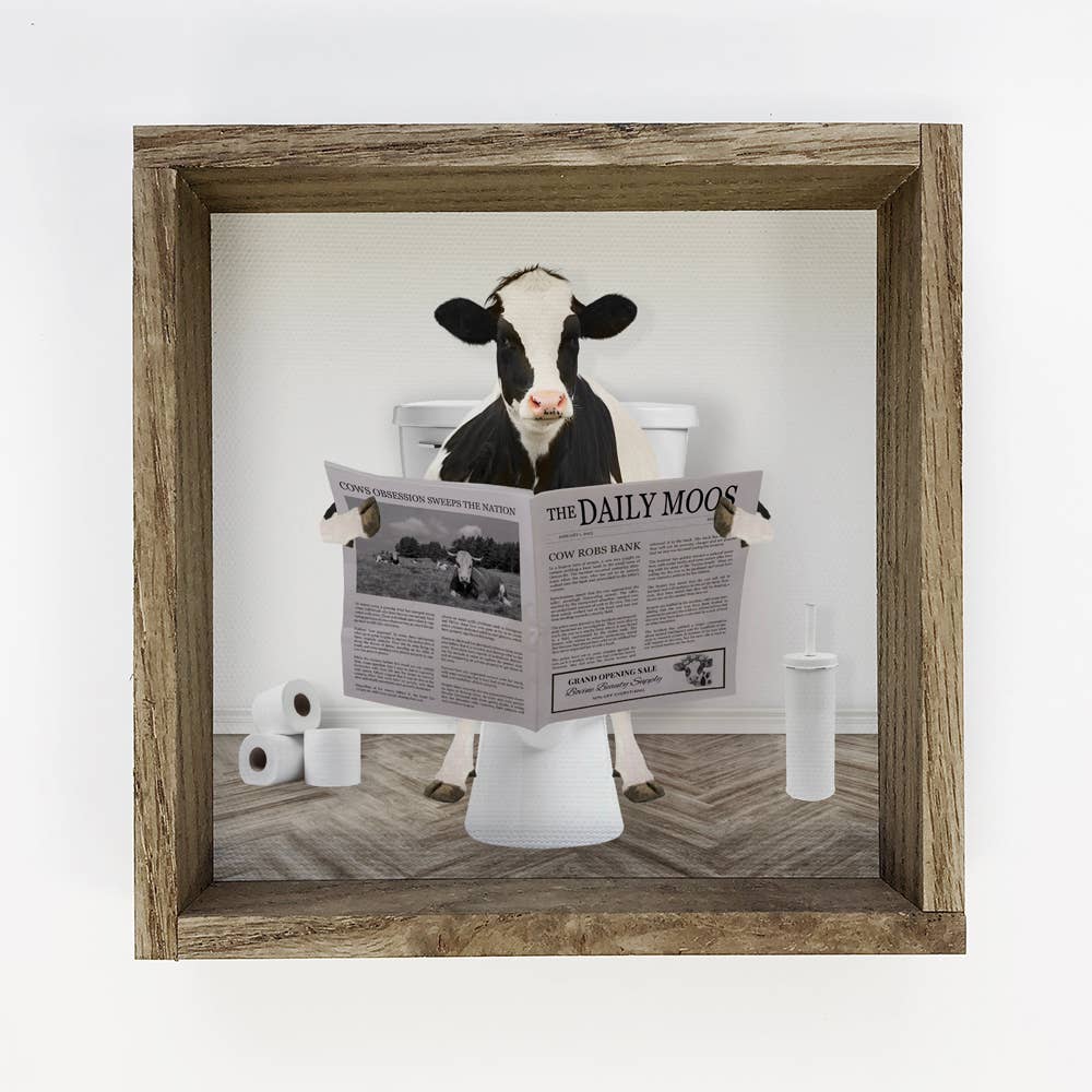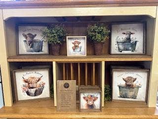 This cute bathroom wall art is perfect for a funny gift or fun bathroom art. This highland cow is one of our bathroom art top sellers! These funny animal signs are great for any boutique. This cute shelf or wall art piece is perfect for a whimsical touch of decor. These are eye-catching and popular signs to sell in any boutique! • Printed with high resolution archival giclee inks • Fine art cotton canvas mounted on wood • Solid hardwood frame in shown stain colors • Sustainable American oak or alder wood • Made in the USA in our Utah studio • MINI 6" tall x 6" wide x 1.25" deep w/ 1/4" thick frame • SMALL 11" tall x 11" wide x 1.25" deep w/ 1/4" thick frame • MEDIUM 15" tall x 15" wide x 1.5" deep w/ 3/4" thick frame • LARGE 20" tall x 20" wide x 1.5" deep w/ 3/4" thick frame • Signs may have +/-1" variations • All signs can stand on a shelf or table (Medium & Large can also hang on a wall) • Farmhouse style frames have small rustic imperfections that make them unique