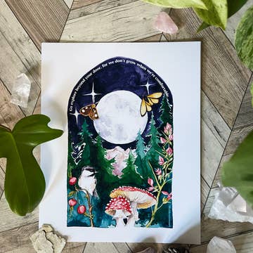 📏 Sizes: 5x7 or 8x10 inches 🖨️ Printed on Fine Art Matte Paper 📦 Packed with Backing Board + Protective Cellophane Sleeve (No Frame) 💜 This watercolor + mixed media artwork features a serene rock stack nestled between mossy trees, adorned with the rune for JOY. A full moon rises high above, casting soft light across the scene in dreamy hues of pink, green, purple, and minty blue. ✍🏼 The original was hand-painted by Melanie Bess (The Swimming Owl) with mixed media.