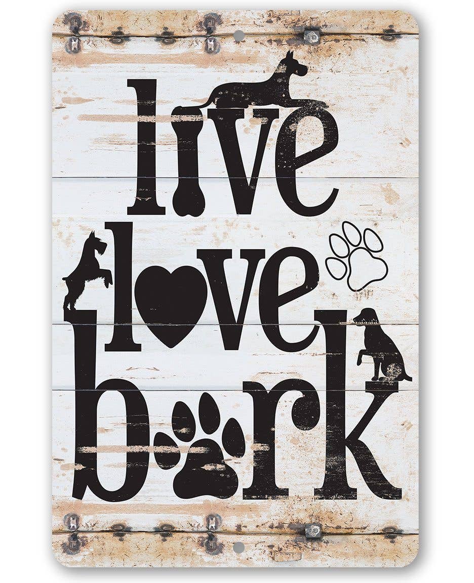 Tin - Live Love Bark - Metal Sign - 8"x12"/12"x18" - Use indoor/outdoor - Gift to Dog Lovers The Perfect Gift - A truly unique gift guaranteed to bring a smile Durable - 8" x 12" or 12" x 18" Aluminum metal sign printed with epoxy ink so you can hang it inside or outside Easy to Hang - Comes with two screw holes and it's light enough to be mounted with double-sided foam tape or Command Strips Guarantee - I´m so sure you´re going to love the sign. Made in the USA (Tomball, Texas) in our family-owned shop
