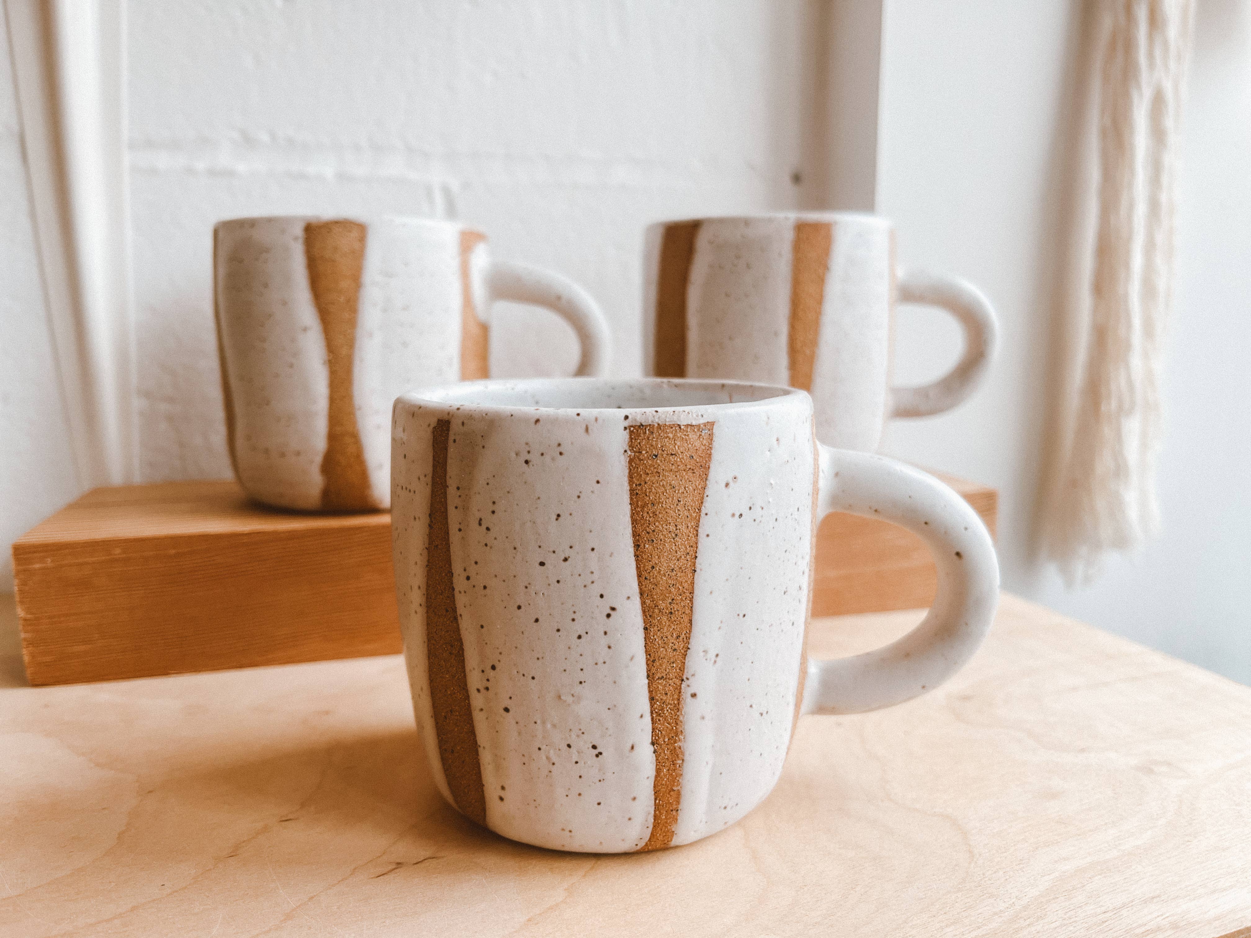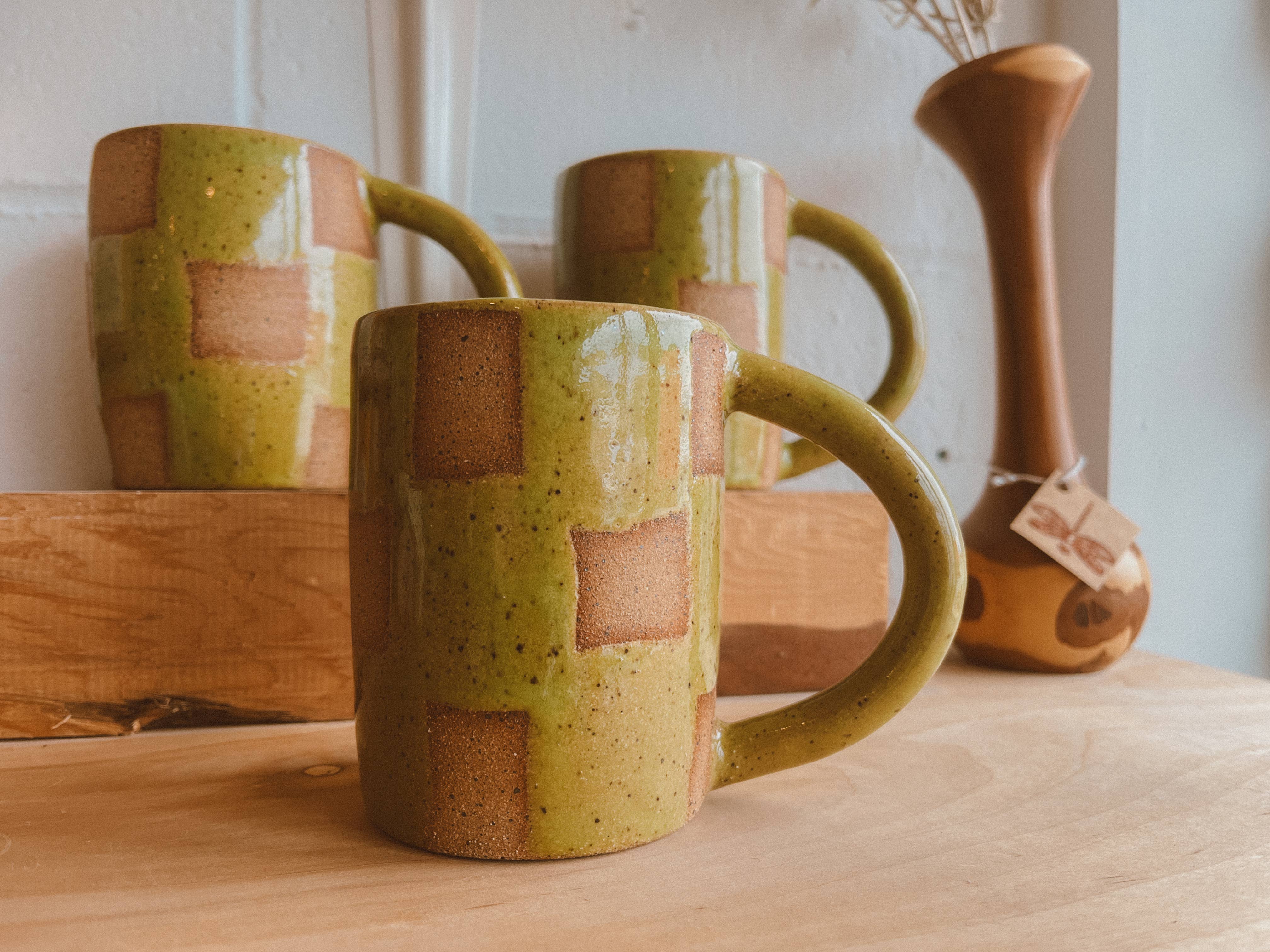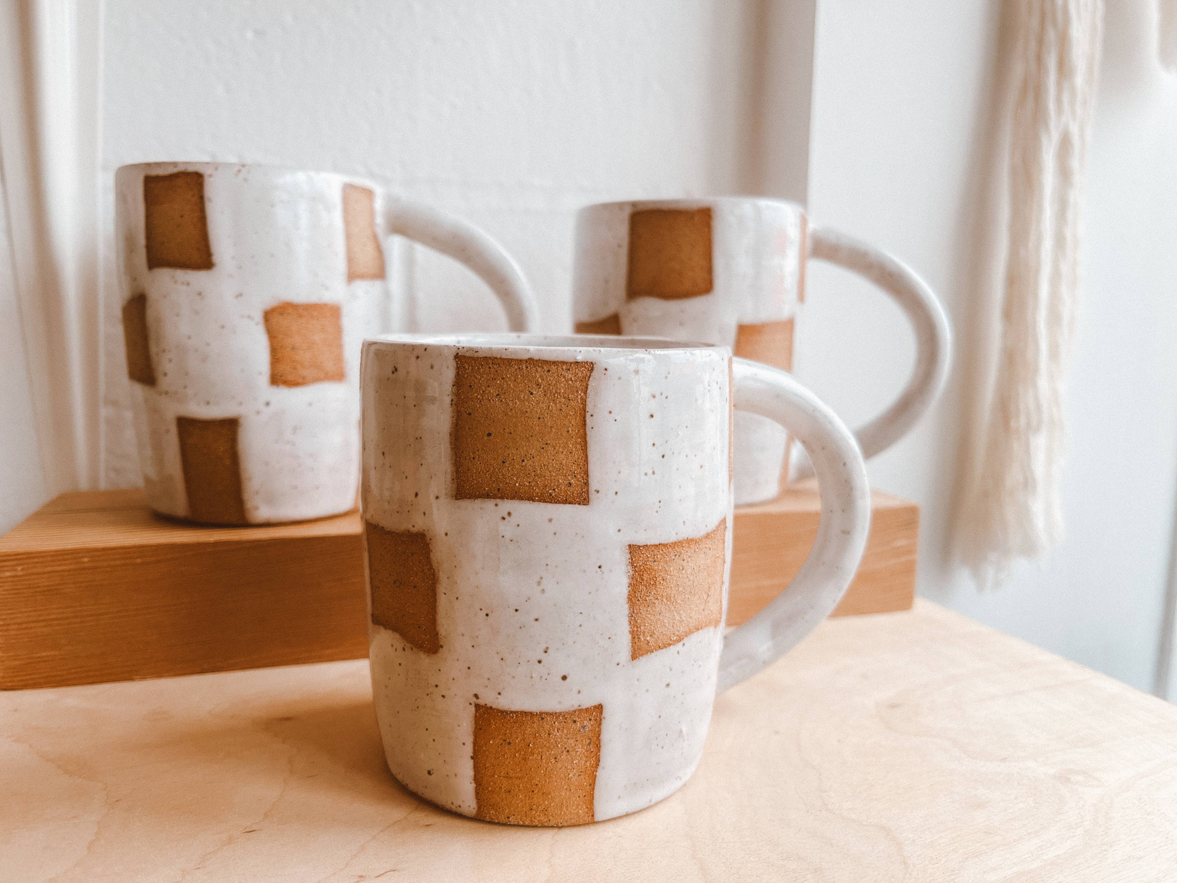 Everyday ceramic mug with big checkerboard pattern. Each mug is hand painted, giving it a unique and hand crafted appeal. A large, easy to hold handle makes it a pleasure to use and a mug you will reach for daily. Dishwasher safe. Approx 3.5” heightHolds approx 10 oz