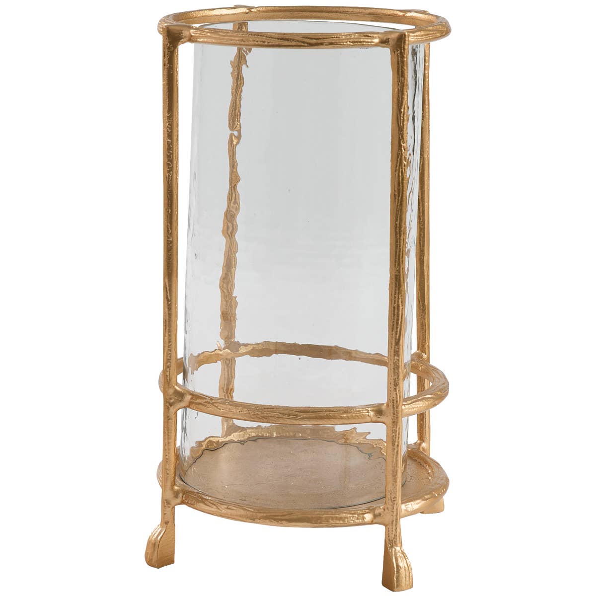 • Everyday Glow Upgrade - Add instant ambiance with a sleek hurricane that elevates pillar or taper candles, transforming any room into a cozy retreat and doubling as a striking centerpiece on any surface. • Sculptural Modern Frame - Hand-cast aluminum with a textured metal cage surrounds a clear glass sleeve for a luxe, gallery look that pairs effortlessly with contemporary decor without overpowering your vignette. • Protected Candlelight - The enclosed glass cylinder shields flames from drafts for steadier burn and less wax mess, perfect for relaxed evenings on a patio table or intimate indoor gatherings. • Versatile Styling Options - Works beautifully solo or grouped on a dining table runner, console, mantel, or home office shelf, blending with seasonal accents and florals for year-round decor. • Surface-Safe Convenience - This padded base helps prevent scratches and slippage while the smooth glass insert wipes clean quickly. This item comes in gold and metallic colors. About This Product Sculptural and sleek, this candle stand holder brings modern sophistication to any setting. Crafted from sturdy metal with a clear glass hurricane, it's designed for both pillar holders and taper holders, offering versatile styling for real or LED candles. The cylindrical glass shields flames from drafts, making it an elegant indoor candle holder for a mantel, console, or dining centerpiece, and a reliable outdoor candle holder for a covered porch or patio gathering. A weighted aluminum base with soft pads helps protect surfaces and keep the glow steady, while the textured framework adds artful dimension among home accents and decorative accents. Use it solo for a refined statement or pair with other pieces to build a glowing tablescape. Low-maintenance and easy to clean, it arrives ready to illuminate, and also makes a thoughtful gift for design lovers who appreciate timeless details.This decor piece comes in gold and metallic colors with the perfect measurements for any surface space.