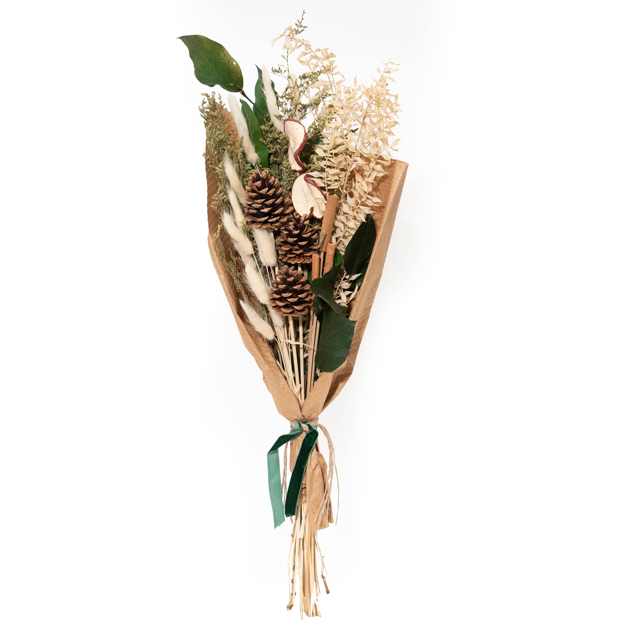 Our floral team designed this festive holiday bouquet using a mix of natural pinecones painted gold, preserved eucalyptus, dried orange slices, and red berries to create this warm and inviting winter style bouquet arrangement. Each bouquet is designed and handcrafted in our California design studio. - 25" long - Comes in packs of 6.