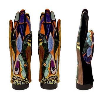 Artist Pablo Picasso, Picasso Face digital print done in a Suede Feel texting glove with touch screen and text friendly design. Upgraded palm of soft faux suede. Special fingertip applique designed for using on touchscreen devices such as phones and tablets. Colors - multi - 3 pc min. One Size Fits Most.