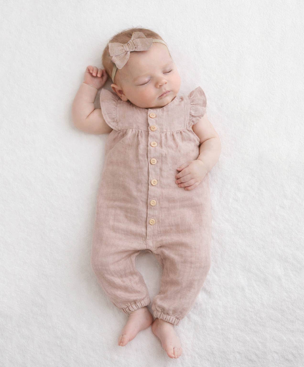 Available in four timeless colors, each jumper comes with a matching head-bow to complete the look. Details: Short Sleeve design perfect for warm days or with a matching cardigan Ruffle sleeves for a charming touch Functioning Wooden Buttons on the front Leg Snaps for easy diaper changing Made from 100% linen Photogenic and timeless apparel Color descriptions: Oat - natural linen color Ash blue- a dusty blue gray color Vintage Pink - A dusty pale muted pink or beige pink Plum - a dark mauve shade or eggplant or dusty dark purple Care Instructions: Machine wash on cold gentle cycle with like colors lay flat or hang to dry Iron on high heat if needed