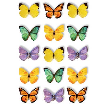 28 Large die cut stickers, boxed. Bring beauty to your life with this beautiful box of Victorian-era butterflies. We selected this offering of die-cut butterfly stickers from our treasured collection of Victorian scraps. Scraps, dating from 1880-1910, were enormously popular die-cut papers used to adorn scrapbooks. The color printing of this early form of the sticker was extraordinarily beautiful, which is especially fitting for these flying rainbows. Art and literature have long celebrated the butterfly for their beauty and symbolic power. This box contains twenty-eight different butterfly stickers that may be used to decorate scrapbooks, correspondence, notecards, journal, gifts, or wherever a butterfly seems appropriate.