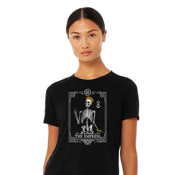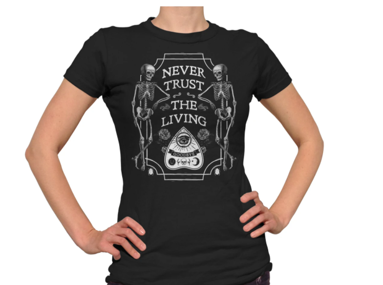 This funny goth shirt is the perfect romantic gift for your favorite fiend. Featuring a grim reaper couple, this cute horror shirt is perfect for an anniversary or Valentine's Day gift for a couple with an appreciation for gothic fashion and a dark sense of humor about love and death. Color: Black Shirt Info: pre-shrunk, baby soft, light weight, ringspun cotton hand printed in the USA with eco-friendly water-based inks fashion-forward, form fitting look runs small, please see sizing chart Our fashion-forward ladies tees run small and are designed for a form fitting look, so be sure to check out our sizing chart below. We print on soft, light weight, ringspun cotton using eco-friendly water-based inks. All of our items are designed and hand-printed to order in our southern California studio.