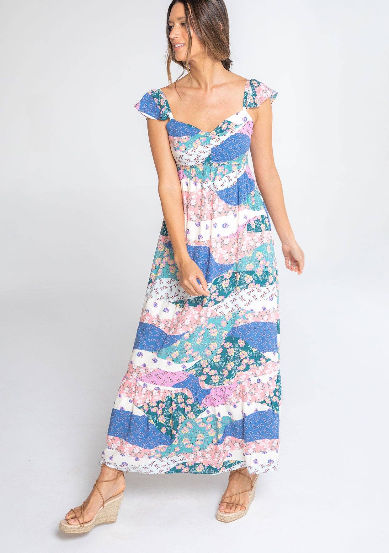Beatiful color and pattern mixing. Bust is smocked and starts out very small. Can fit a child in the bust. The smocking does stretch quite a bit and does feel like a true free size in regular sizes, but not plus-size.