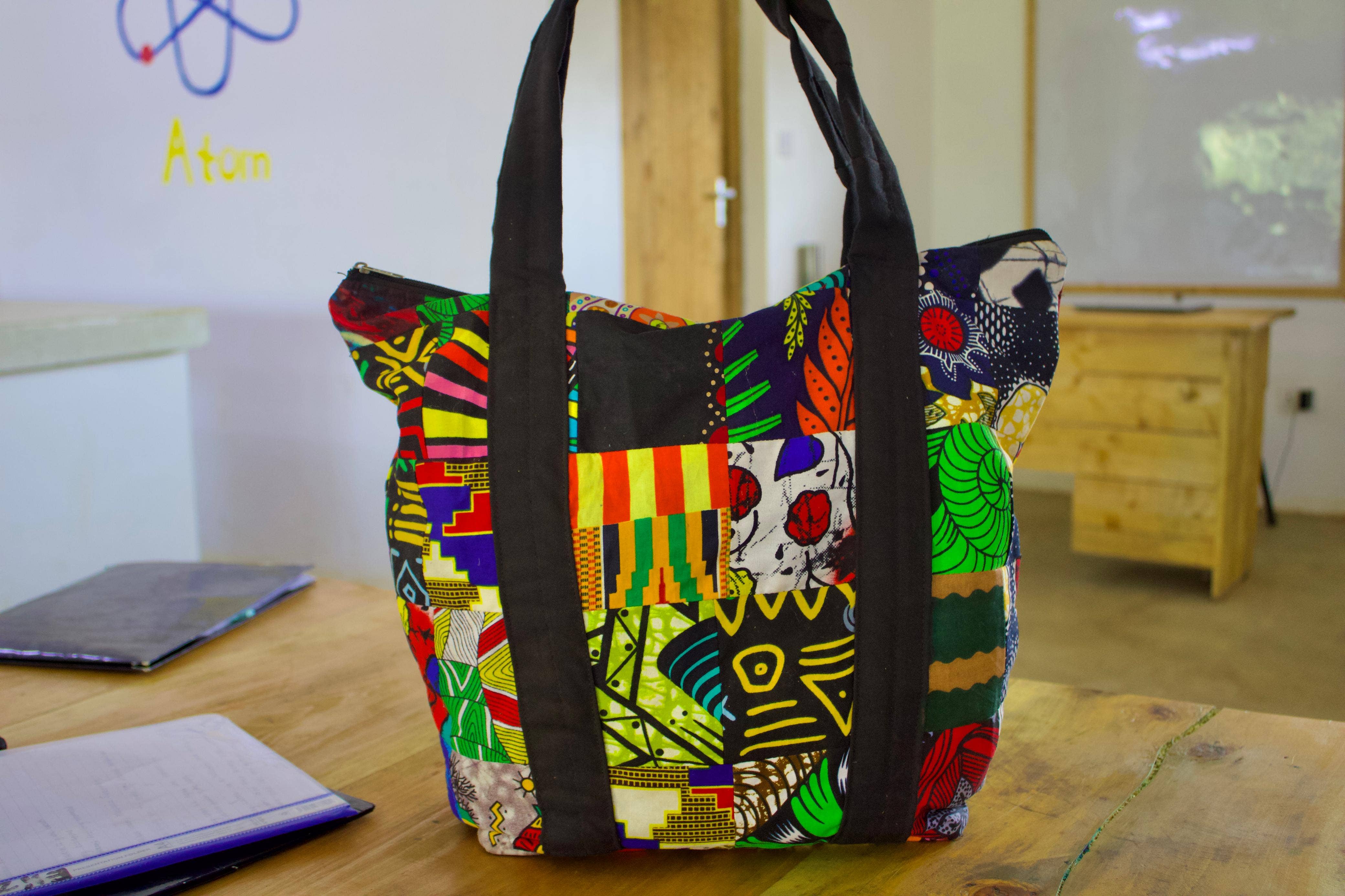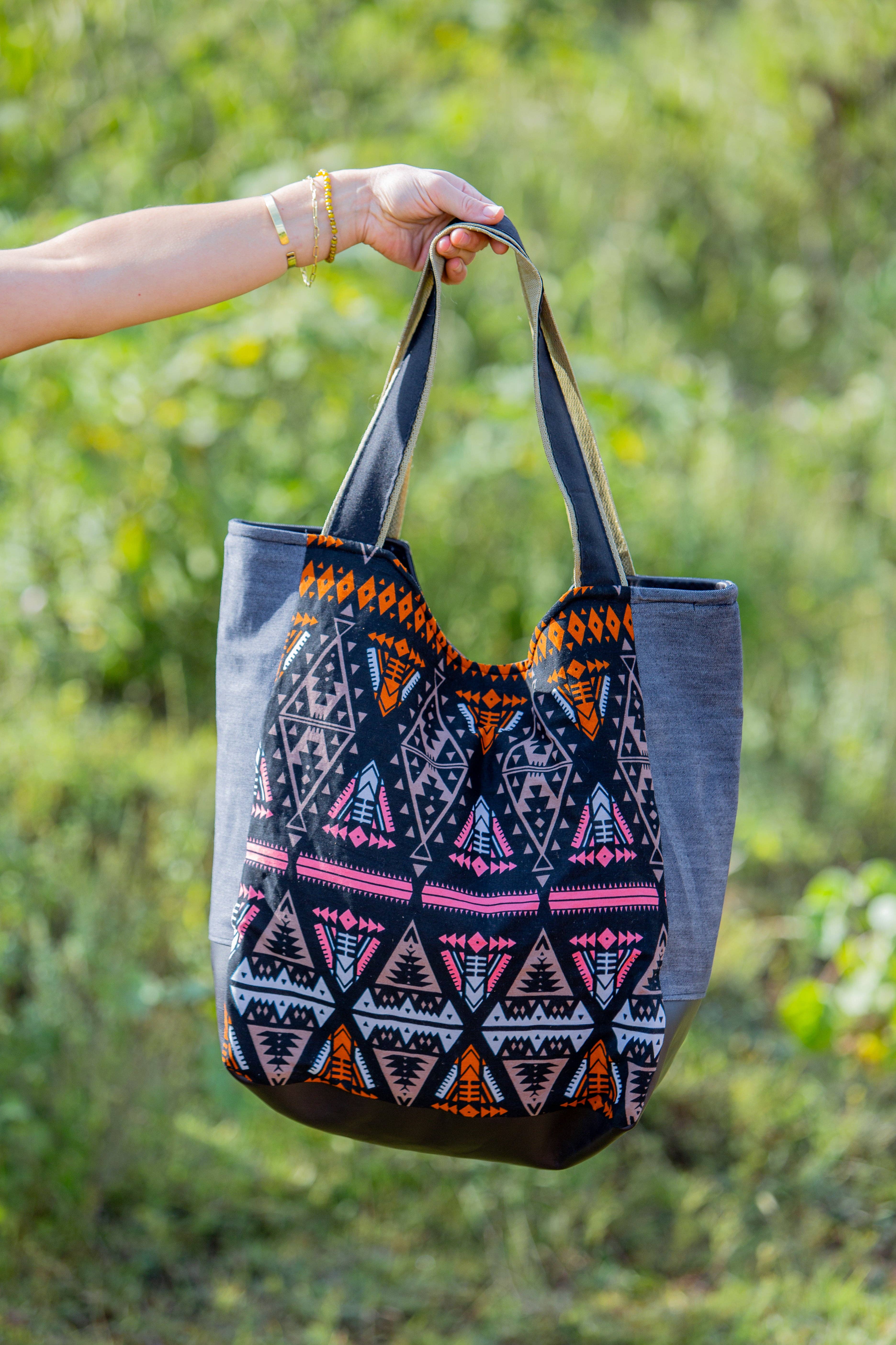 Our Bloom Canvas Tote Bag is designed with the colors of spring in mind. This bag can carry it all - books from the library, essentials on an outing, snacks for a picnic and countless errands and activities in between. Made with a colorful African patterned fabric bottom and a sturdy canvas top and strap, each bag is pieced and sewn together by our artisan team in Nanyuki, Kenya. Measures approximately 16" high by 14" wide.