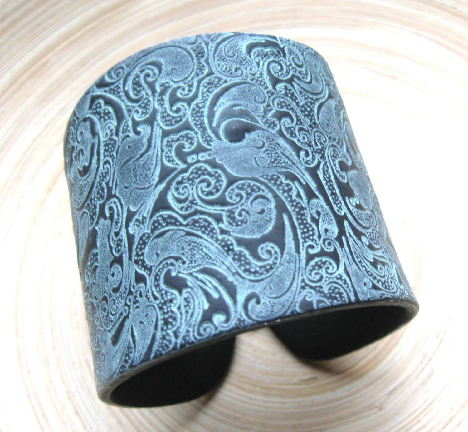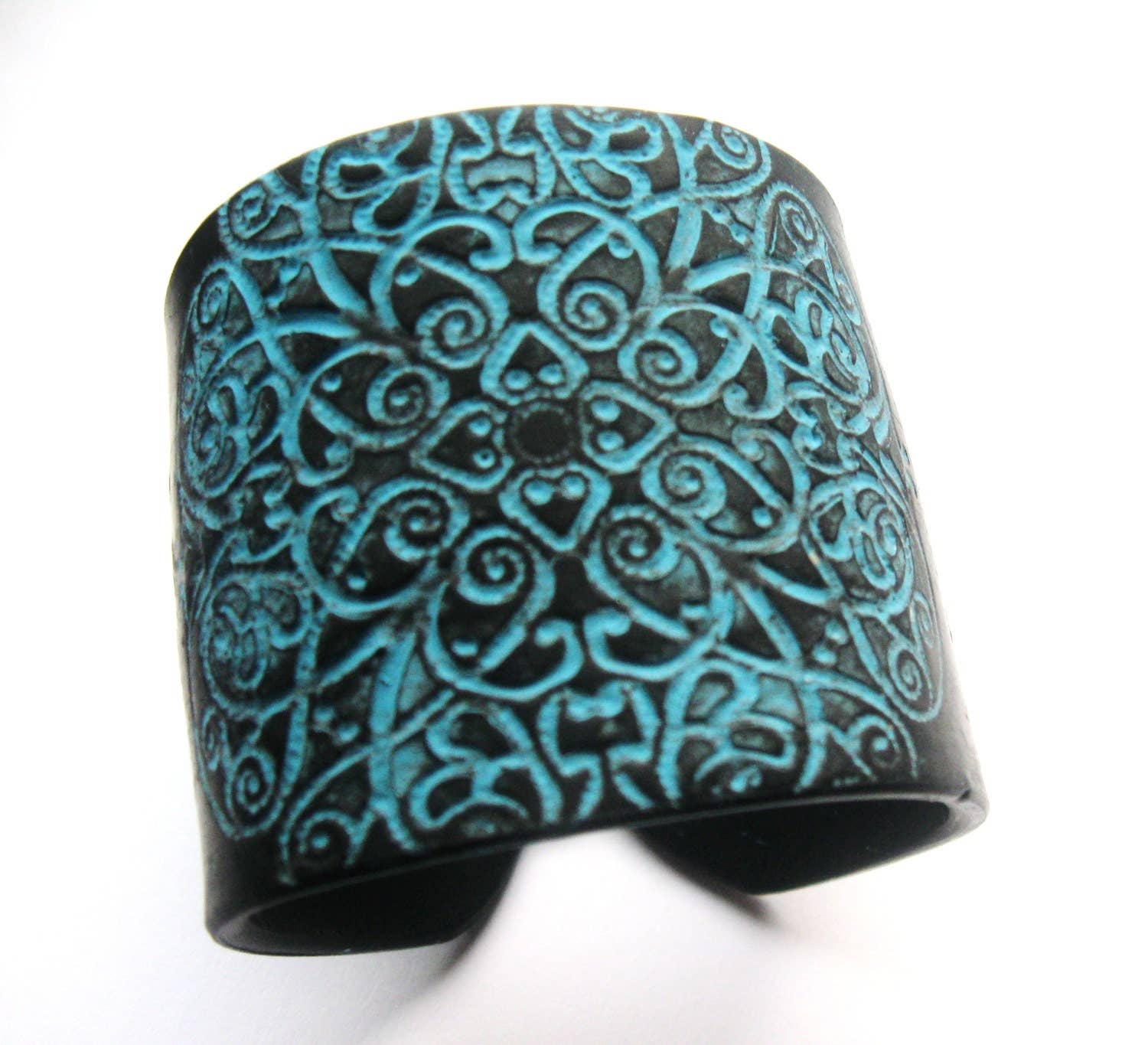 Copper Cuff Bracelet with Contrasting Asian Dragon Design in Black. Made of polymer clay, it is flexible and lightweight. This cuff is almost 2" wide and comes with an antiqued copper colored clasp. Bracelets are made to fit a 6" wrist, a few custom sized cuffs can be included with each order.