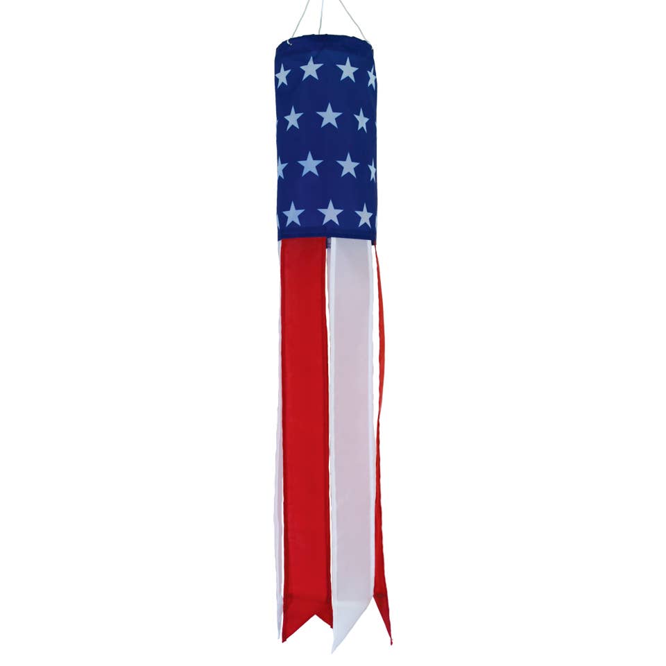 One of our top-selling products! Featuring quality embroidered stars with color-coordinating tails that flutter whimsically in the breeze, this U.S. Stars and Stripes windsock will fly out the door. - Weather-resistant polyester fabric. - Polycarbonate plastic hoop maintains windsock shape. - Quality embroidered stars. - 12 color-coordinated tails with sewn edges. - No assembly required. - String bridle with attached snap swivel for easy hanging