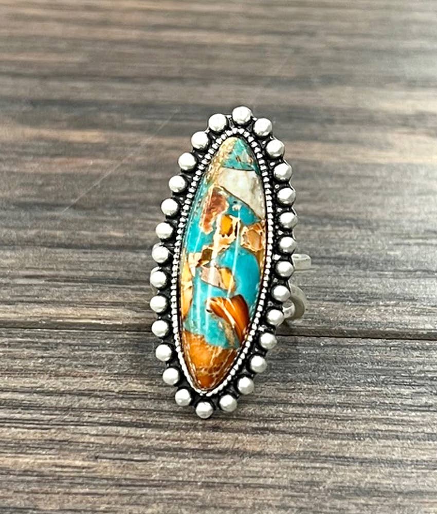 Big! 2.2" Long, Navajo Gemstone Ring, Brass Dual Adjustable Band * Adjustable by expanding only both bands, not gemstone * Natural stone varies in size, color, or shape * One size, Adjustable by pull/push brass dual band * 2.2" gemstone on alloy metal, antique silver plate * 12 grams weight * Nickel, Lead & Chrome free