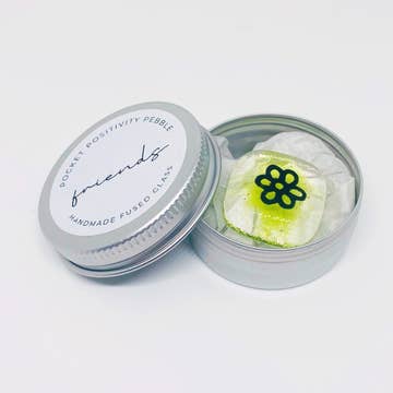 The tin contains a single glass tile with a hand painted flower. Available in seven colours. The friends pocket hug makes great birthday gift, or just to say thinking of you. Smooth and cool to the touch the pebbles are incredibly tactile. The pebble tin can be kept in a pocket or purse. What you need to know: - Glass pebble is approx 2cm square and 6mm thick - Presented in a metal tin 3.5cm diameter with a screw lid - Pack size 6 tins All my glass is made by me in my garden studio in Surrey, UK.