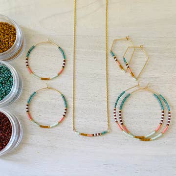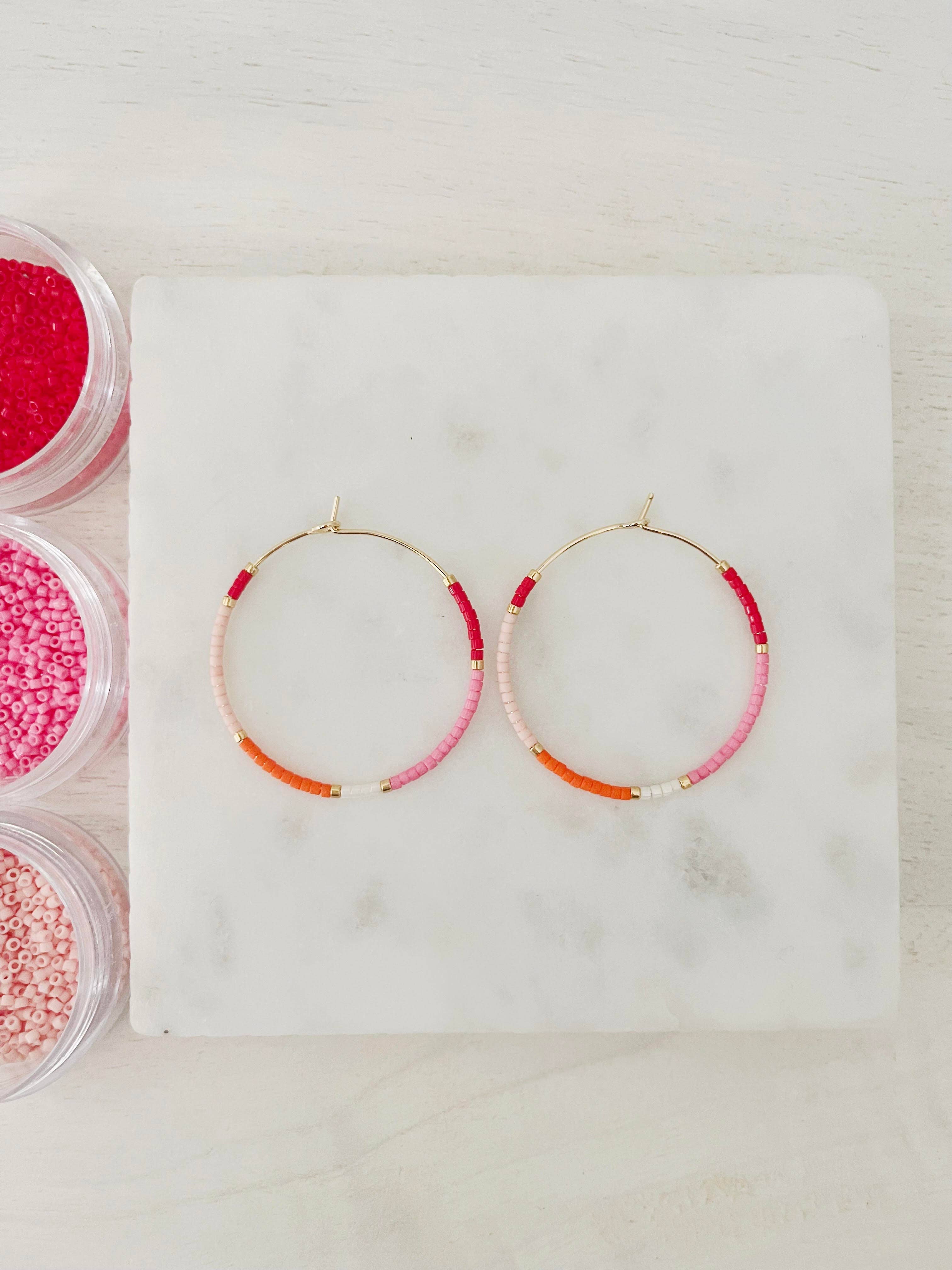 Between the Lines hoops are inspired by contrast - where bold meets calm. Stand alone, or pair effortlessly with other pieces. These hoops bring depth and just the right about of edge to any look. These hoops are destined to become your essential accessory, effortlessly enhancing your style wherever you go. Choose from three sizes: Small 25mm, Medium 35mm (1.38") or Large 45mm (1.75") round weightless hoops. or 35mm pentagon hoops. Miyuki glass beads, used in every hoop design we offer, are a world standard for their high quality, brilliance, and uniform shape. This special collection focuses on color and pattern that will coordinate with any wardrobe. Tiny Miyuki glass beads were carefully chosen to give a variety of texture. If you love to accessorize, then don't delay! These were made for you!