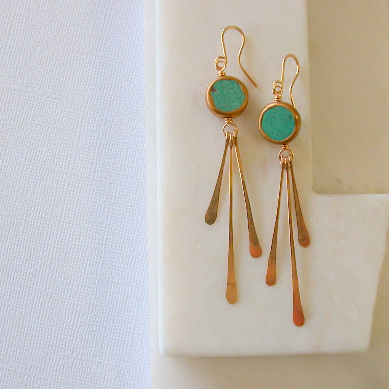 18k gold plated brass hook earrings with glass and magnesite. Each earring weighs .32 oz and measures 4.5 inches.