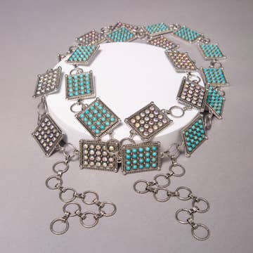 WESTERN CONCHO DESIGN TURQUOISE STONE CHAIN BELT LARGE : NUMBER OF PARTS : 12 HIGH QUALITY TURQUOISE STONE WITH ZINC CASTING BASE SIZE : 42+7.25 INCH EXT SMALL : NUMBER OF PARTS : 10 HIGH QUALITY TURQUOISE STONE WITH ZINC CASTING BASE SIZE : 35.5+7.25 INCH EXT