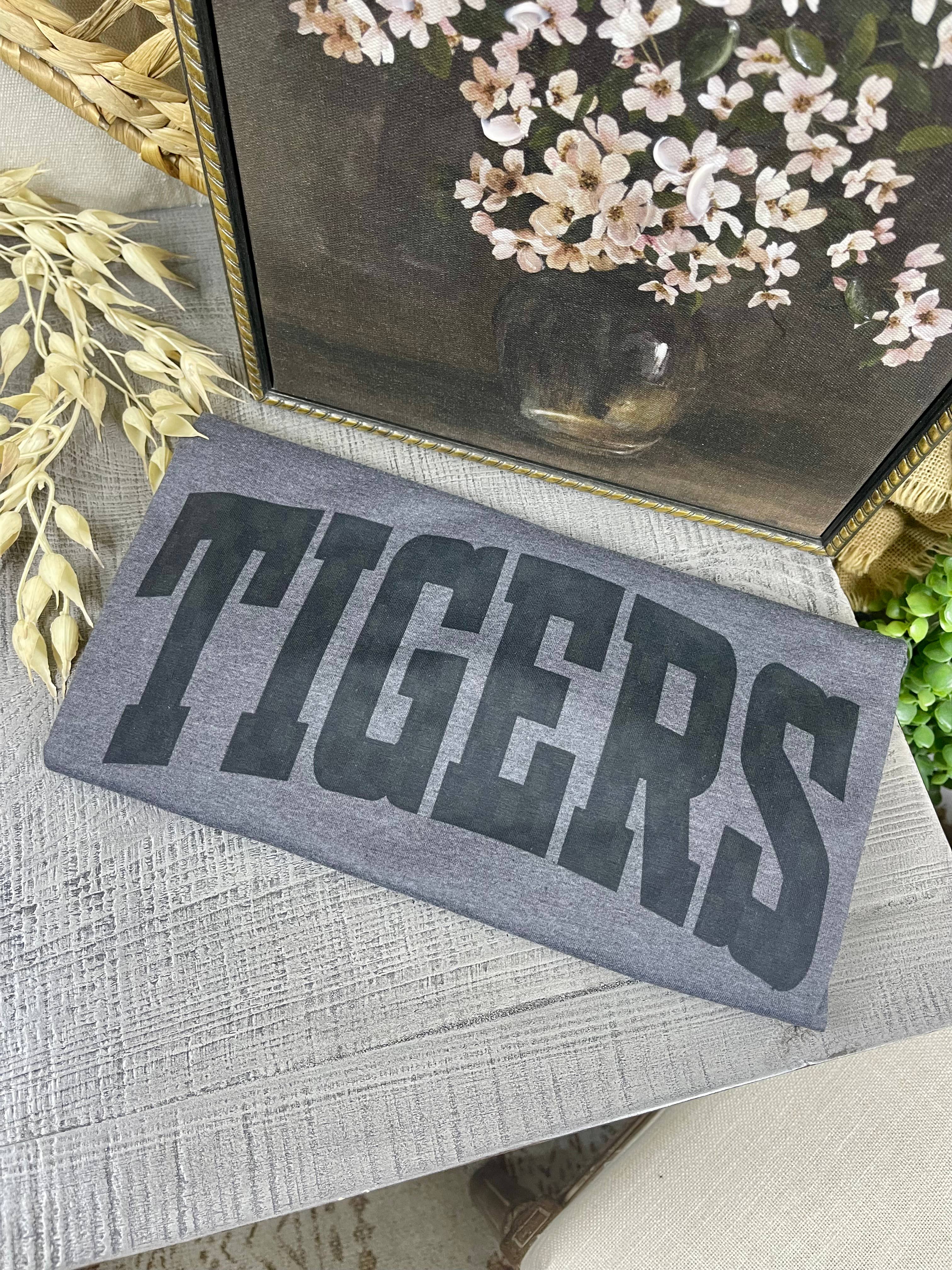 Tigers screen printed as shown in black puffy ink on the Bella and Canvas shirt or Jerzee Brand sweatshirt color of your choice. The black ink is more of a charcoal and will look as shown if printed on a black shirt or hoodie. Soft and comfortable with a unisex fit. If you would like this design with another mascot or on a different color please message us we are happy to work with you on your design! Handmade in my small boutique in Easley, SC where I am a wife, mom of 4, and teacher. Thank you for supporting my small business.