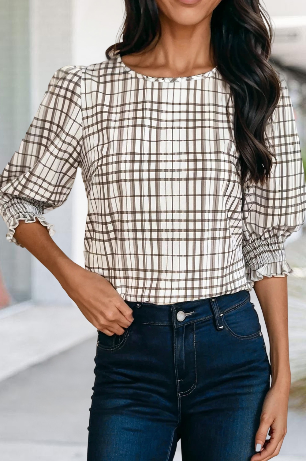 Original Price: $14.00 Wholesale deals on premium quality. DOLMAN SLEEVE SOLID CONTRAST PLAID TOP Size Scale: S-M-L-XL Size Ratio: 1-2-2-2
