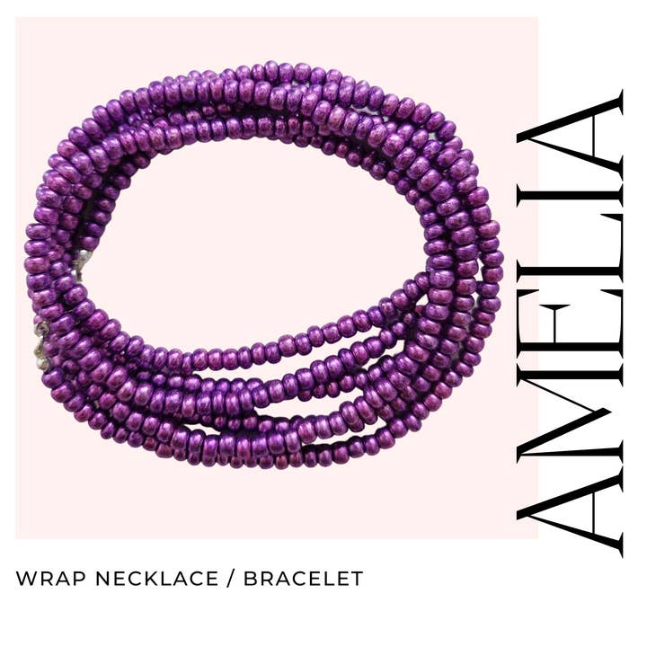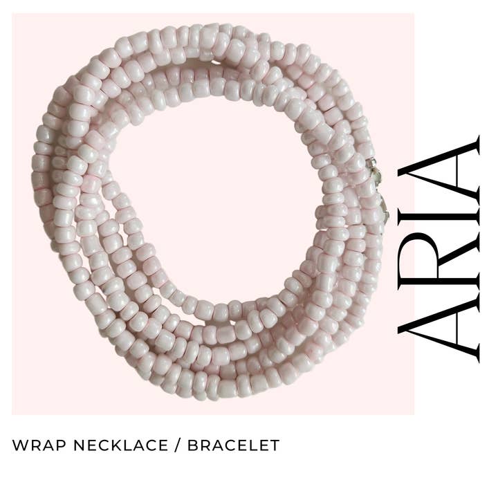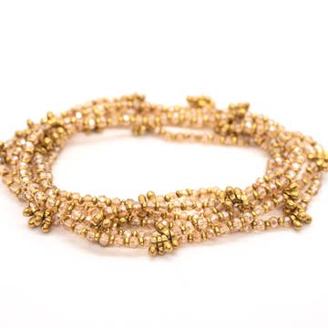 Style as a wrap necklace or bracelet. Measures about 48" in length Colored seed beads, hemp cording, and gold clasp * Please note: Each piece is handmade. Pattern and color may vary slightly.