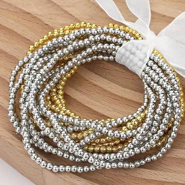25PCS - Seed Beaded Stretch Bracelets • Size : 2.75" H • Stretchable • Lead and Nickel Compliant Add a playful touch to your style with this stacked beaded bracelet set. Featuring multiple strands and a mix of tones in a cohesive palette, this accessory offers texture and visual interest. Ideal for layering or wearing solo, it’s a versatile piece for casual and chic ensembles.
