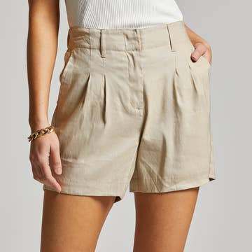 HIGHWAIST PINTUCK DETAIL SHORTS FABRIC: POLY SPANDEX WOVEN 90% POLYESTER 10% SPANDEX ** NOTCHED COLLAR WOVEN VEST: Please search SKU# J14464 - new arrivals, bestseller, active basic, active usa, shorts, classic, formal, woven, high waist, pintuck, set